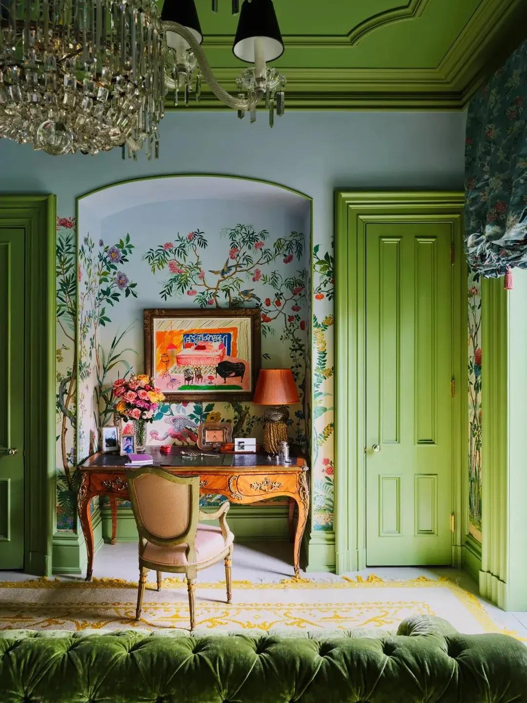 Яркий оттенок зеленого шартрез, в который окрашены карнизы, рамы окон и камин, добавляет современный акцент, подчеркивая игривый и несколько ироничный подход к классике. Не менее символичен и массивный двусторонний диван в обивке из зеленого вельвета. Лили Аллен с юмором отмечала, что такая конструкция идеальна для того, чтобы сидеть спиной к спине во время ссор. Сегодня эта фраза звучит особенно пронзительно на фоне лирики ее нового альбома, посвященного разводу с Дэвидом Харбором.