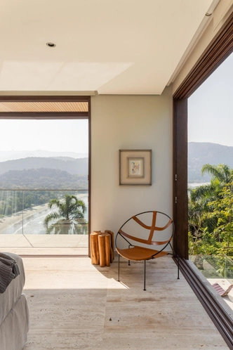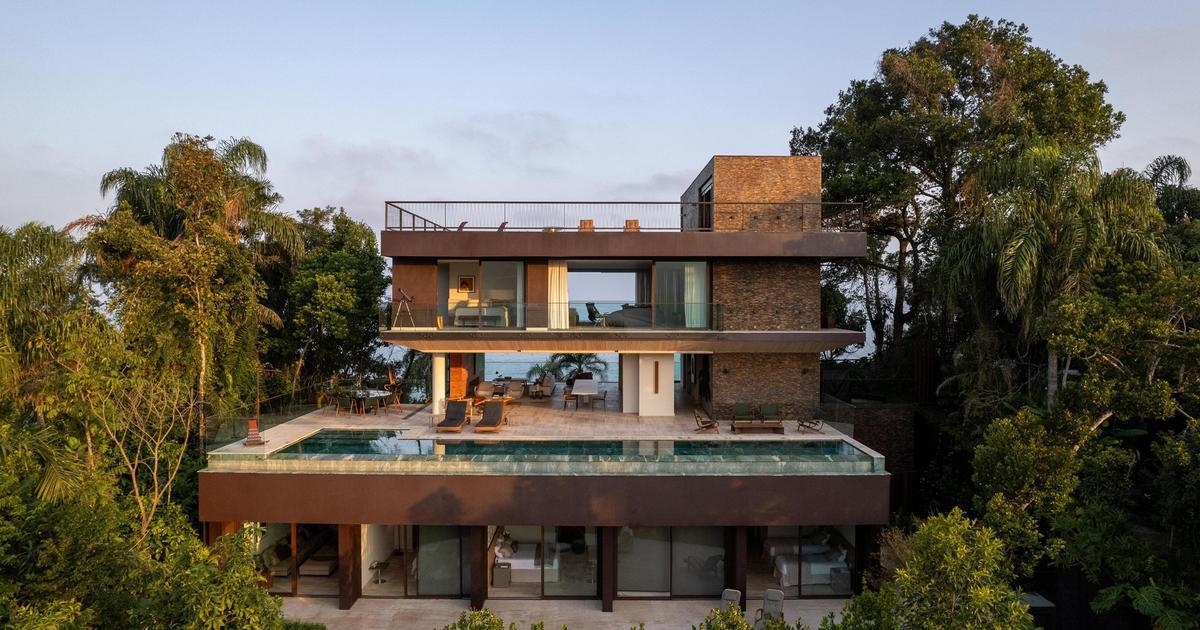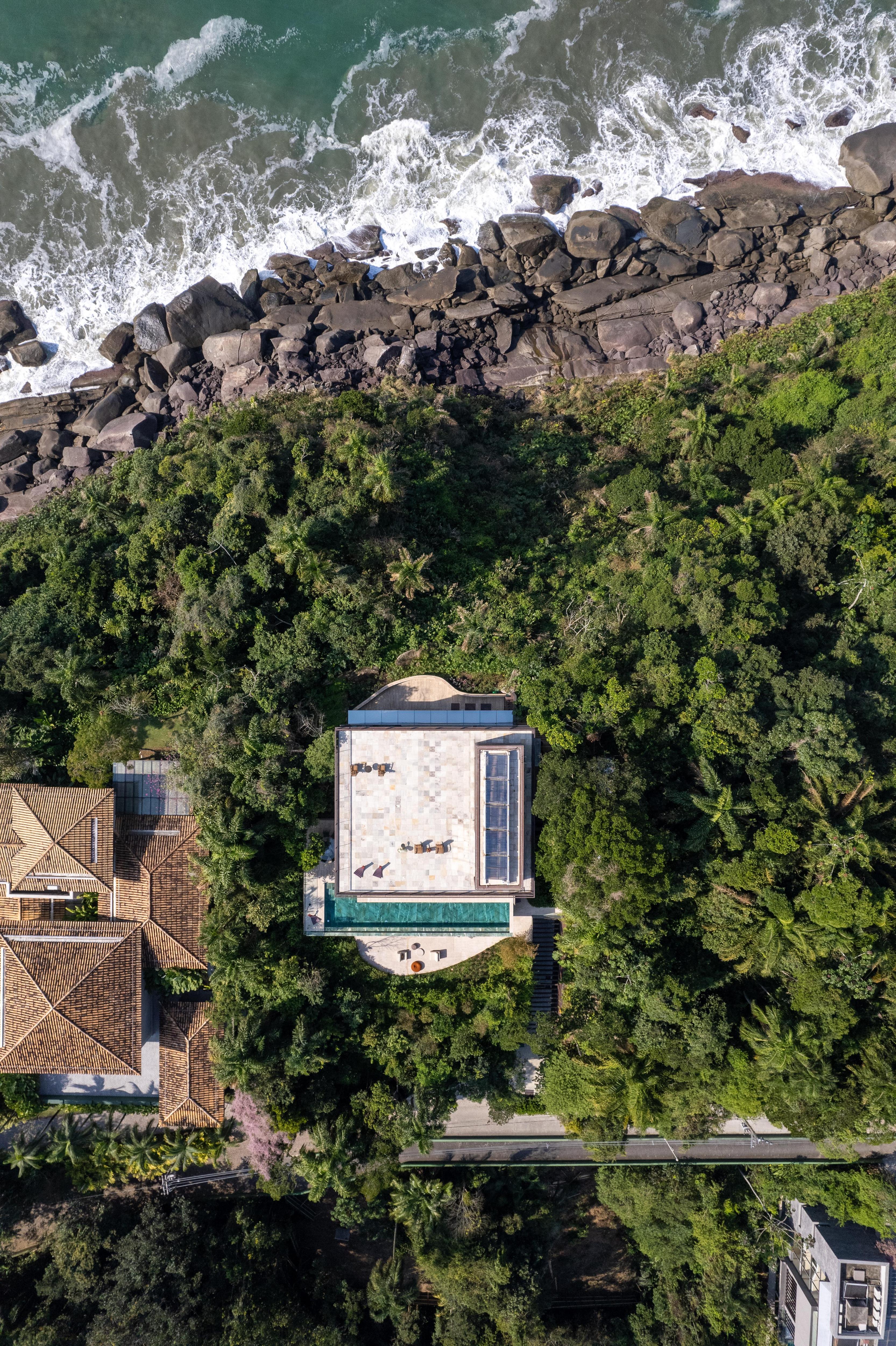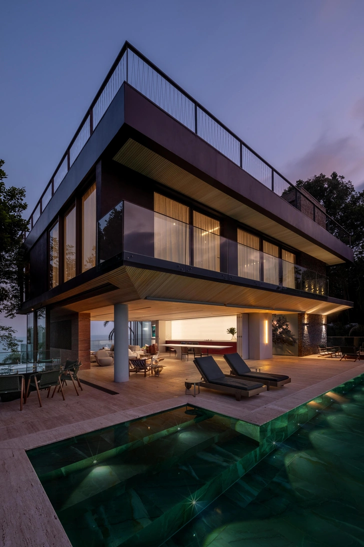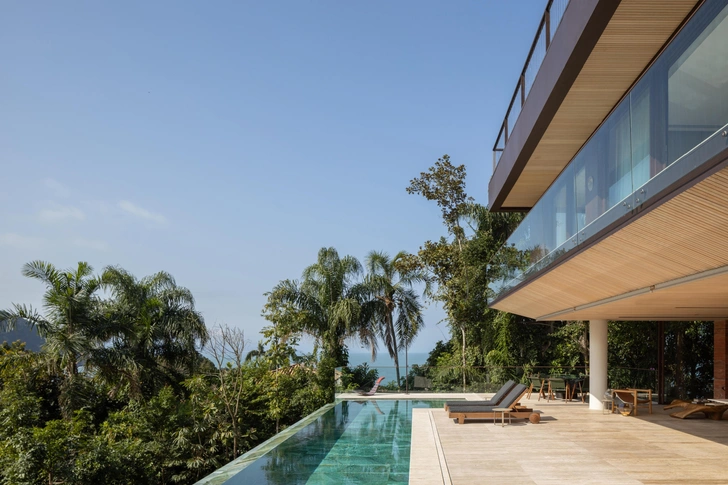 Brisa House стоит на склоне полуострова в Бразилии, поэтому архитекторы FCstudio организовали пространство по вертикали. Дом встроен в рельеф так, что с каждого уровня открывается свой ракурс на океан и лес.