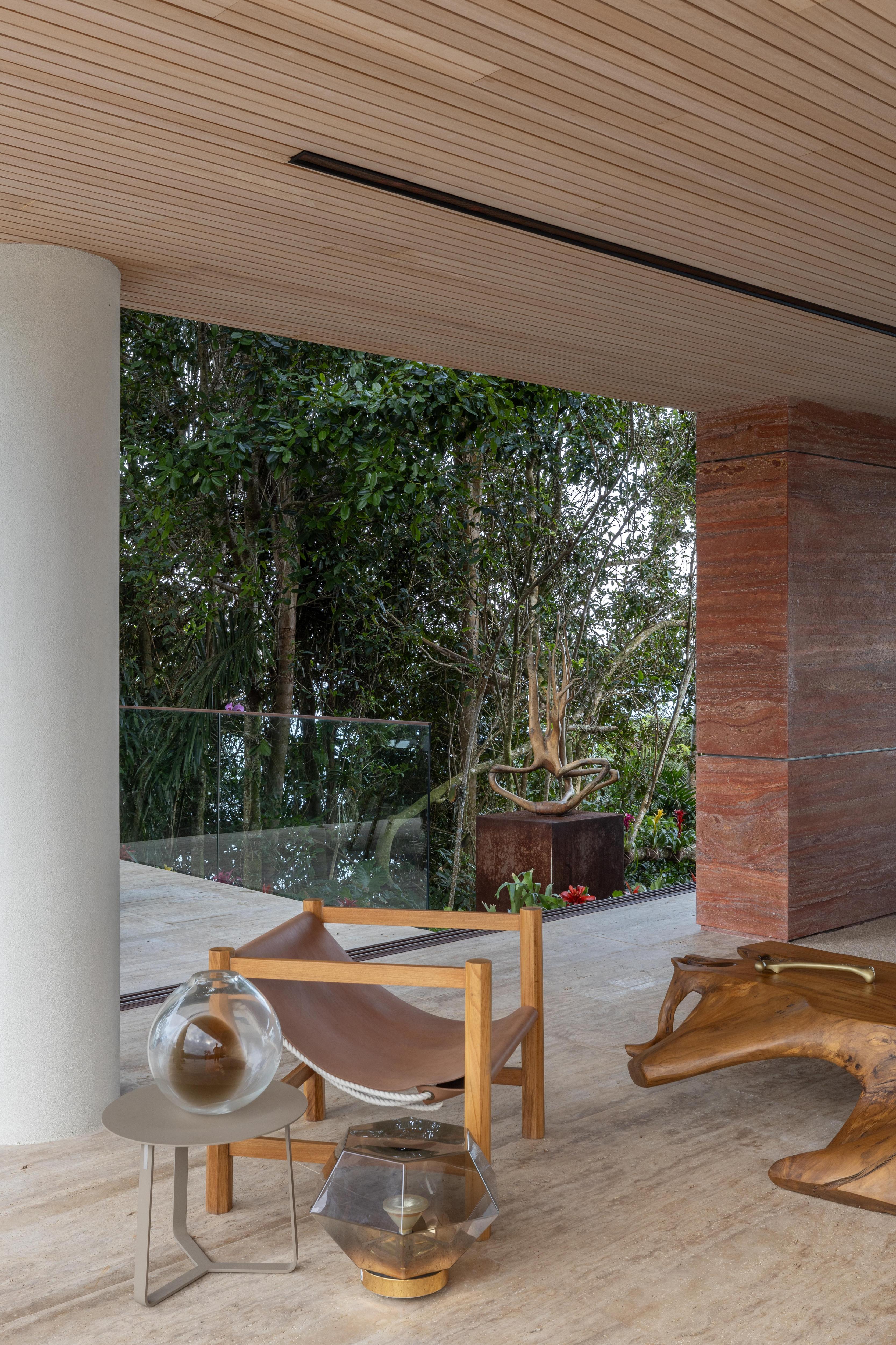 Камин Firepit, FC Studio. Кресло Fredo Lounge Chair, Lorenza Bozzoli для Dedon. Картина Диптих Macio (Díptico Macio), José Bechara. Обеденный стол Equilíbrio, FC Studio. Погреб и кофемашина в комплекте Elettromec для Bontempo. Журнальный столик, Hugo França.
