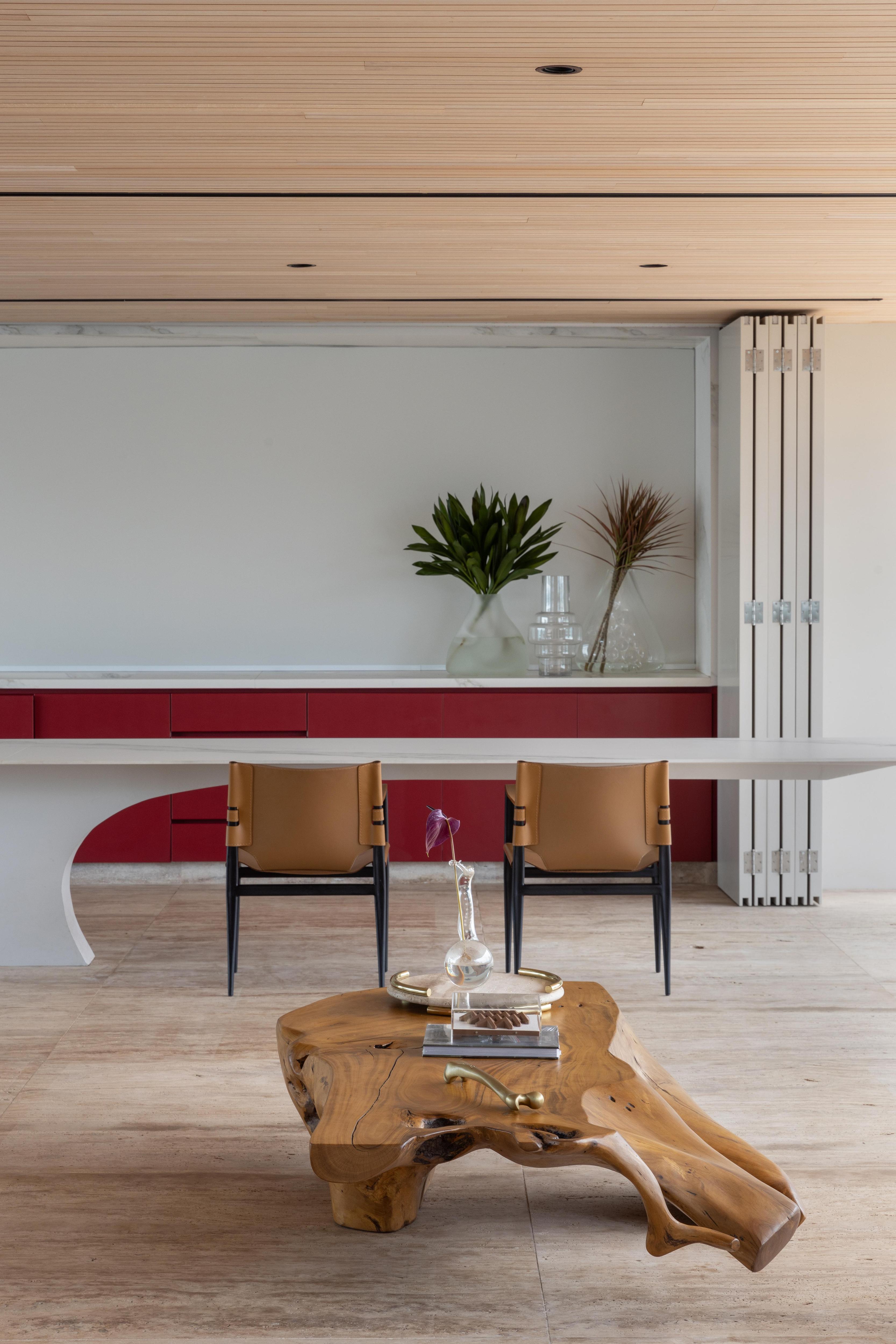 Стол Equilíbrio, спроектированный специально для этого дома, держится на одной опоре. Архитекторы вдохновлялись балетными движениями — легкостью и балансом. Шестиметровая столешница выглядит так, будто парит в воздухе, и только приглядевшись, замечаешь единственную точку опоры. Это самый необычный предмет в доме и настоящая гордость проекта.