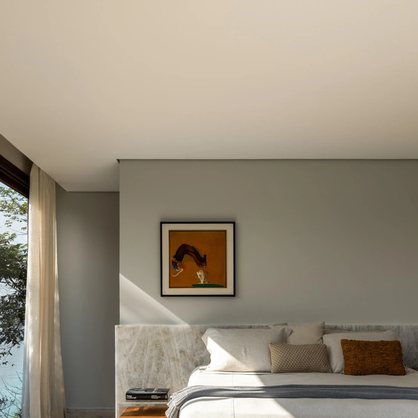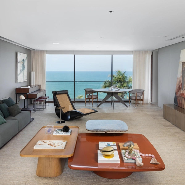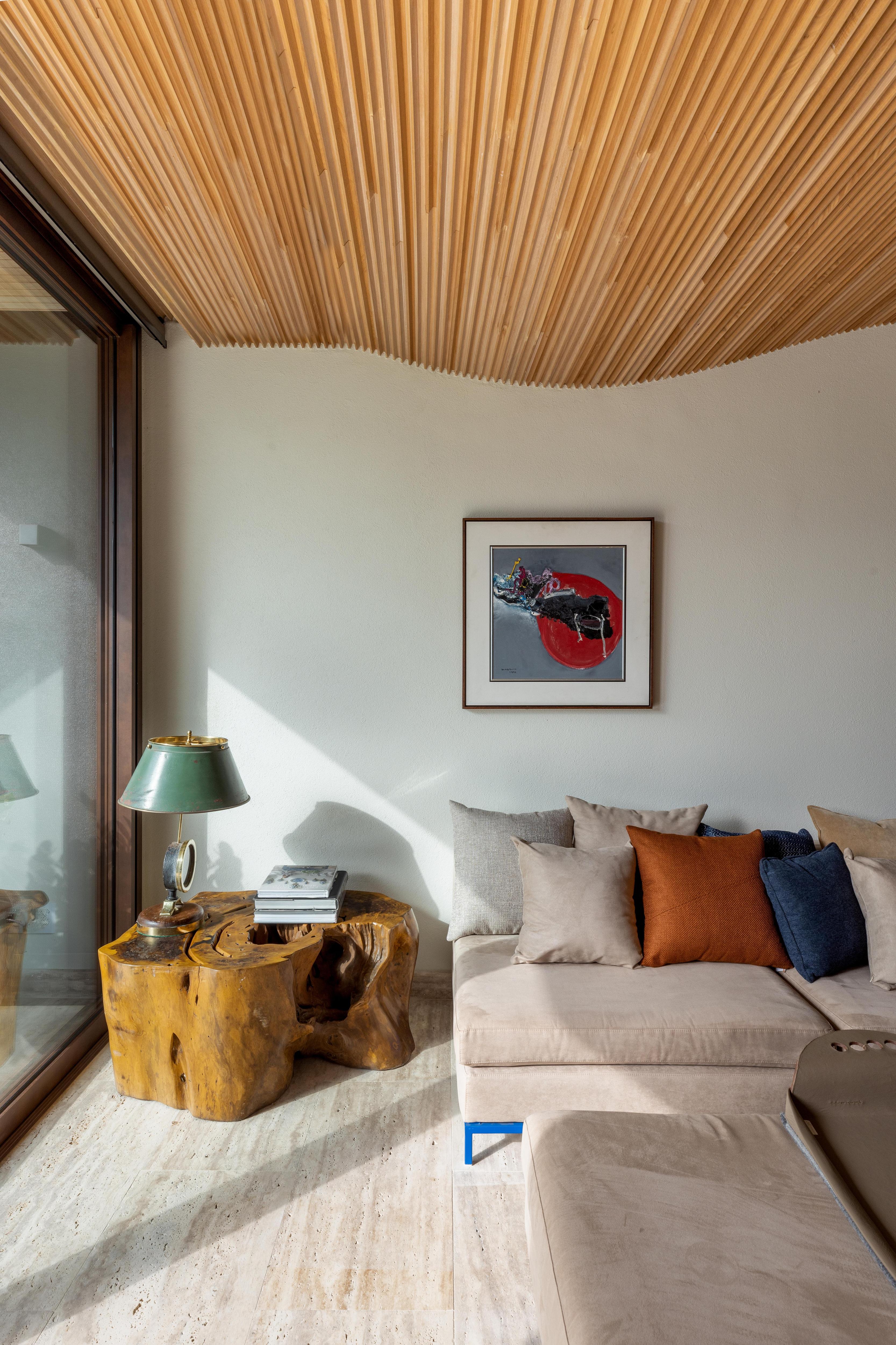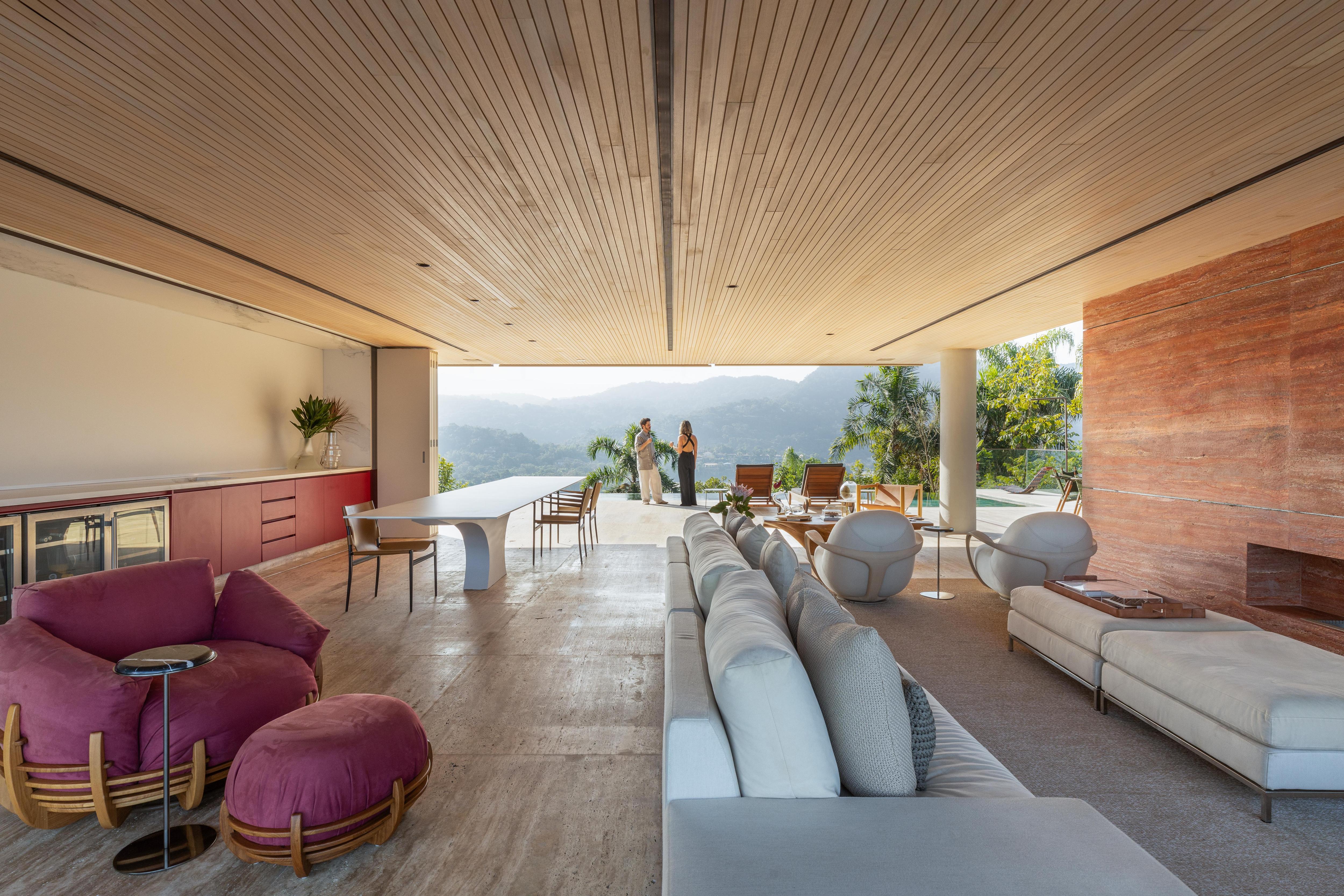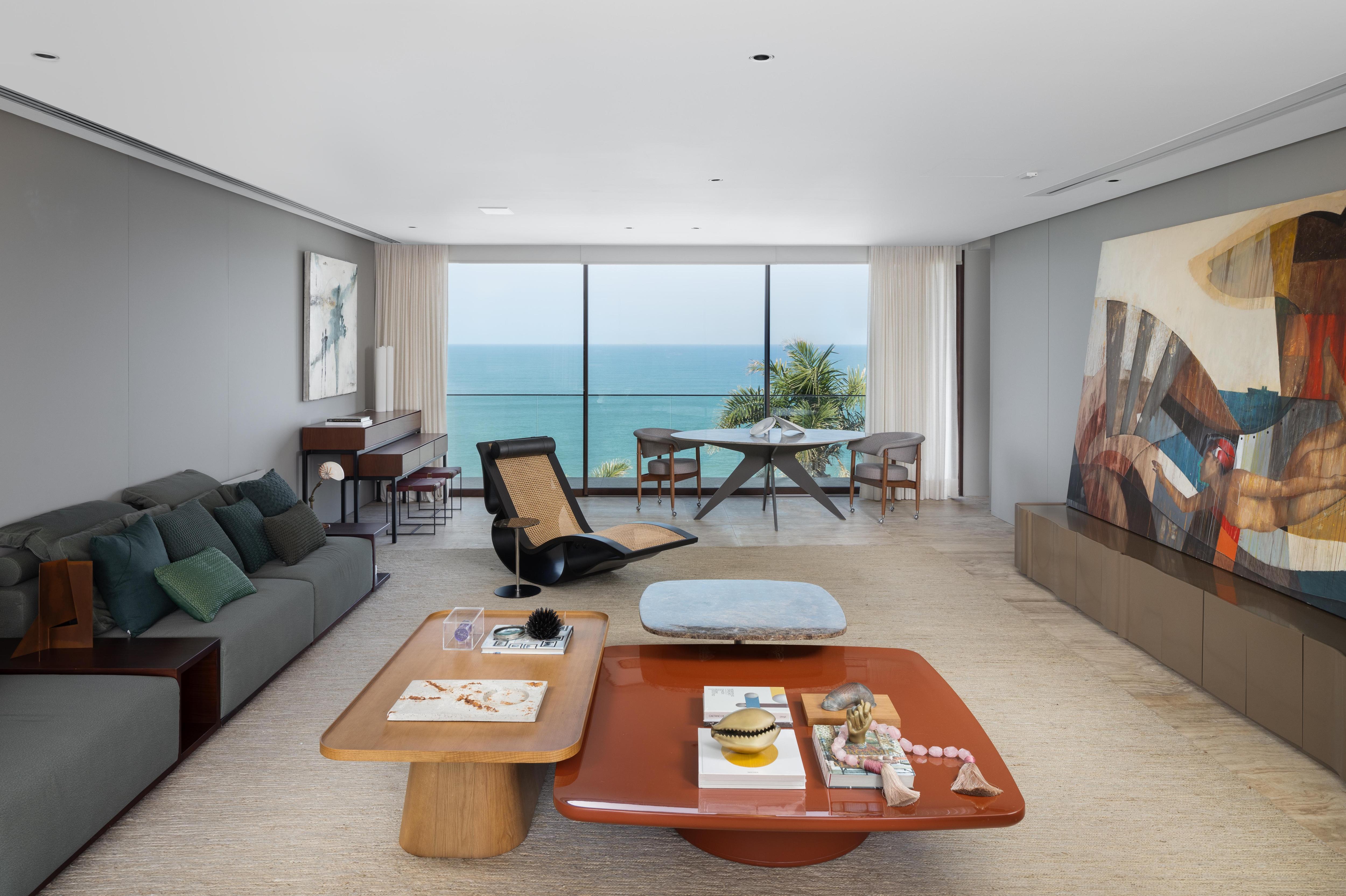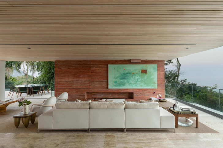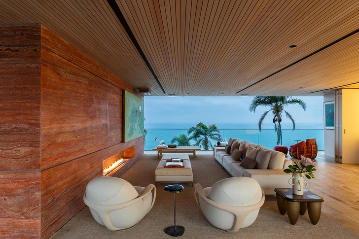 В гостиной главный элемент — стена из красного мрамора Rosso. В нее встроен камин, а также работа бразильского художника Бешара. Телевизор спрятан за подвижной панелью и появляется только когда владельцы действительно хотят его смотреть. В остальное время ничто не отвлекает от вида на океан через панорамные окна.