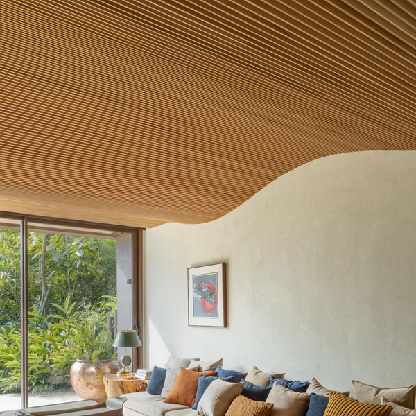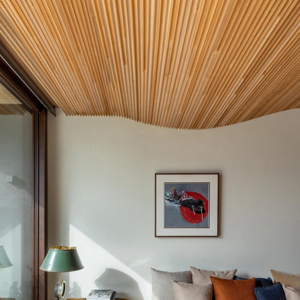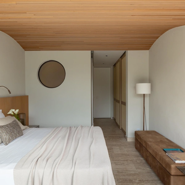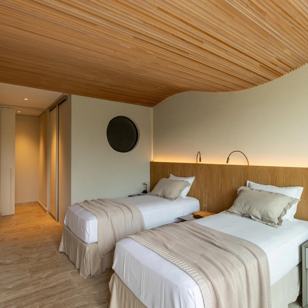 Внутри все продумано для плавного движения — никаких резких переходов, только свет, воздух и постоянное ощущение связи с природой. Материалы выбраны теплые, природные: травертин на полу, дерево на потолке, камень на стенах. Они не только красивы, но и устойчивы к соленому воздуху и яркому солнцу.