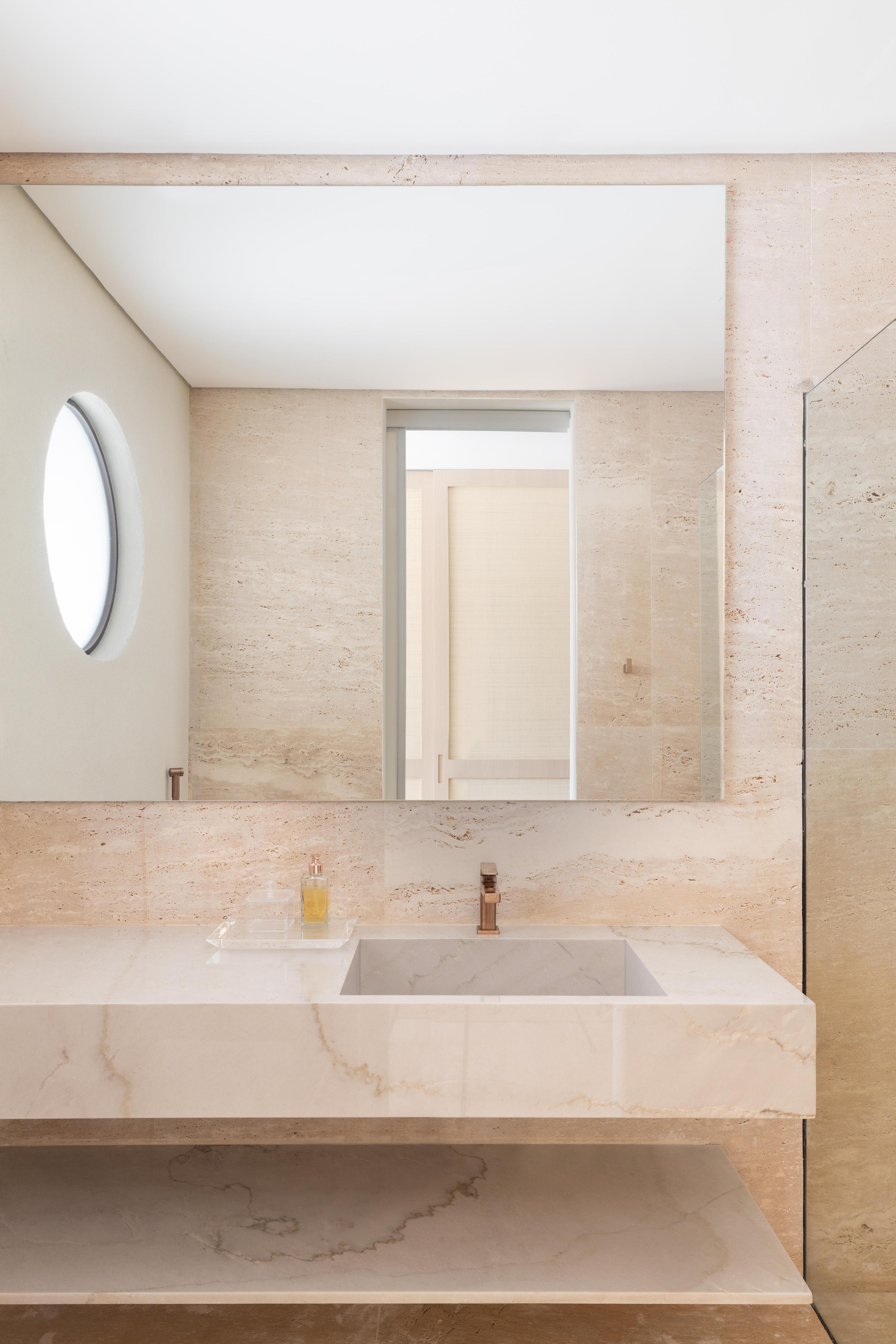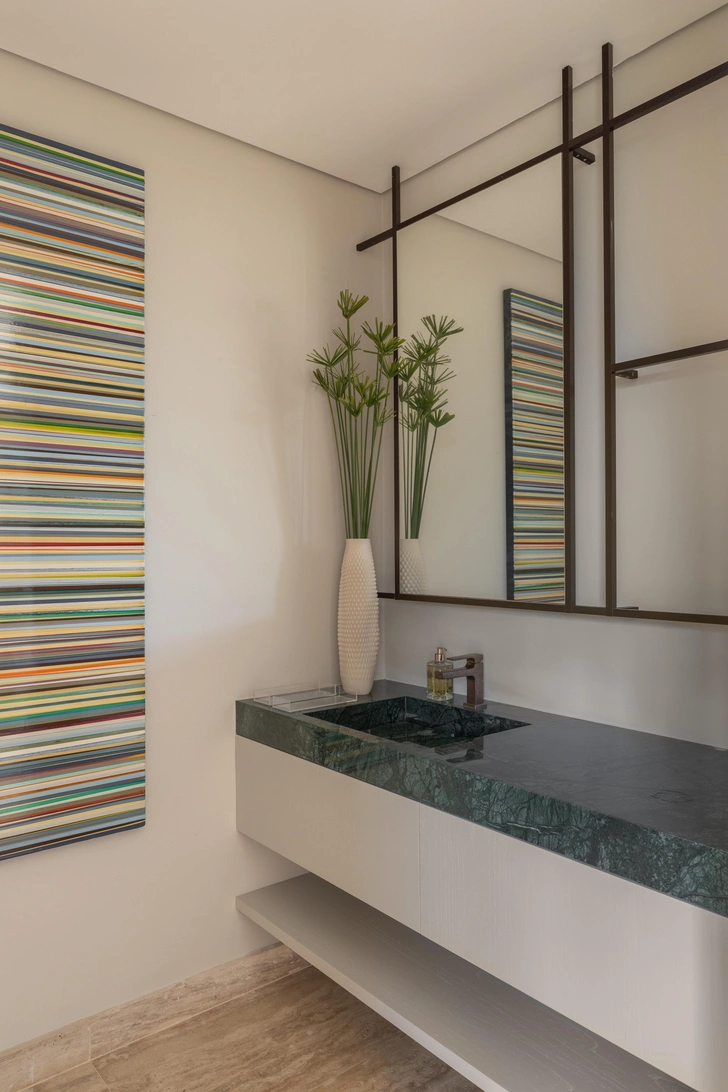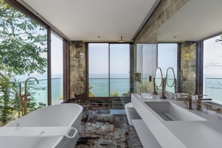 Ванные комнаты — отдельные для него и для нее — тоже с панорамными окнами, выходящими на открытое море. В отделке использовали камень, который нашли случайно: когда распиливали большую глыбу зеленого кварцита для облицовки бассейна, внутри обнаружился темный рисунок. Вместо того чтобы выбросить нестандартные куски, архитекторы решили пустить их на стены и пол в ванных.
