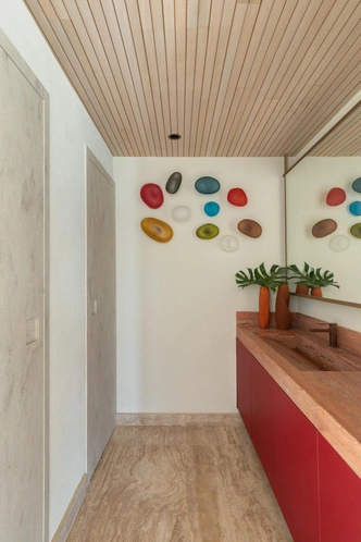 Барная зона со встроенной мойкой, холодильниками для вина и вместительными ящиками для хранения сделана так, чтобы все необходимое было под рукой, но при этом ничего не нарушало визуальной чистоты. Кухонные фасады выбраны глубокого бордового цвета — они контрастируют с нейтральной гаммой камня и дерева и становятся акцентом в этом светлом пространстве.