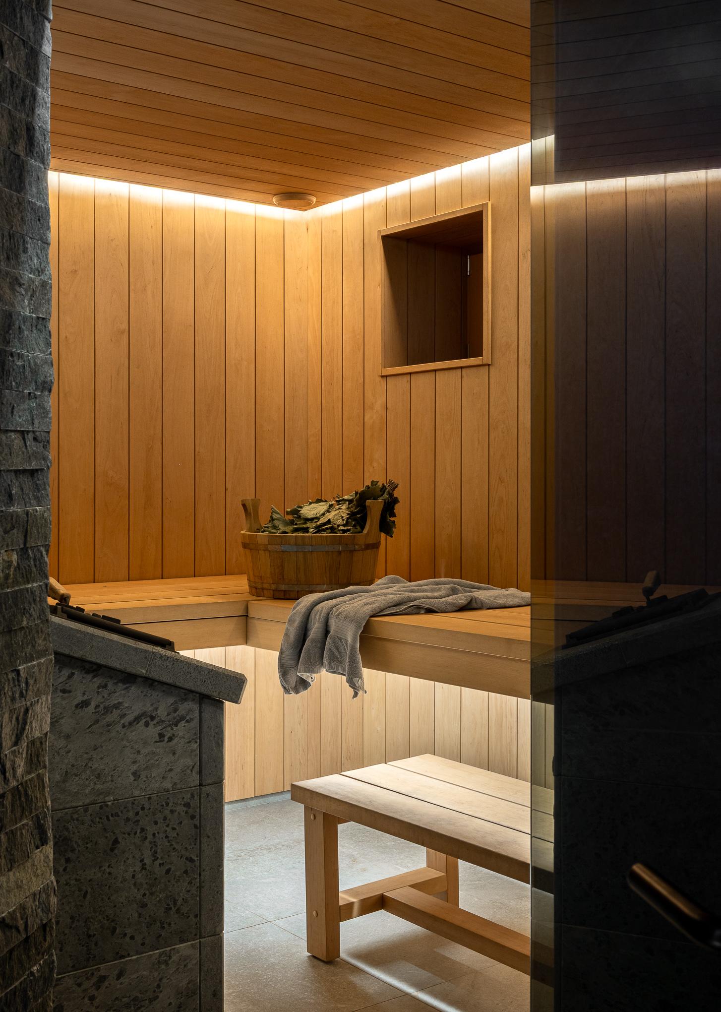 Стены и потолок изготовлены из массива ольхи. Плитка на стене из талькохлорита. Печь облицована камнем из талькомагнезита.