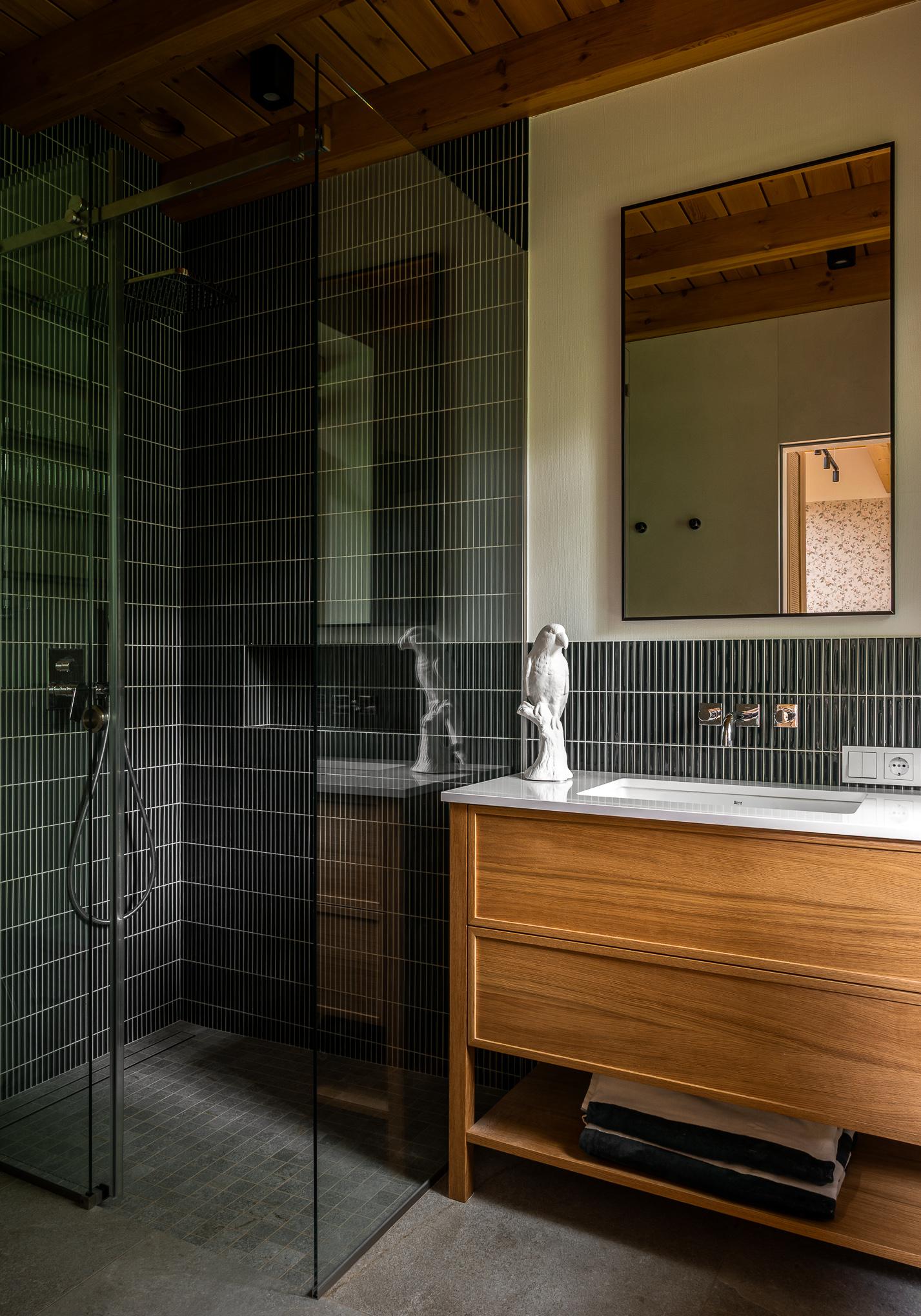 Ванная оформлена плиткой цвета голубой сосны. Ее глубокий оттенок и текстура вступает в диалог с природной палитрой за окном.