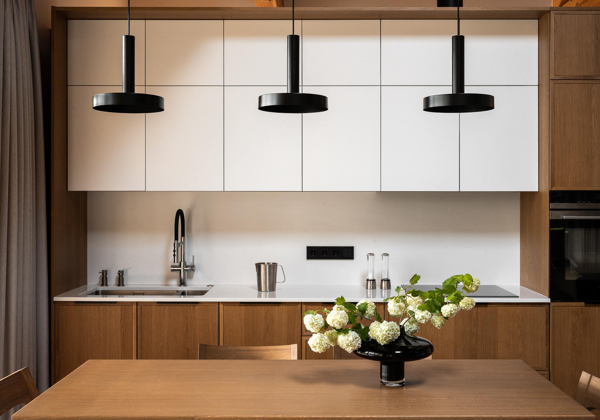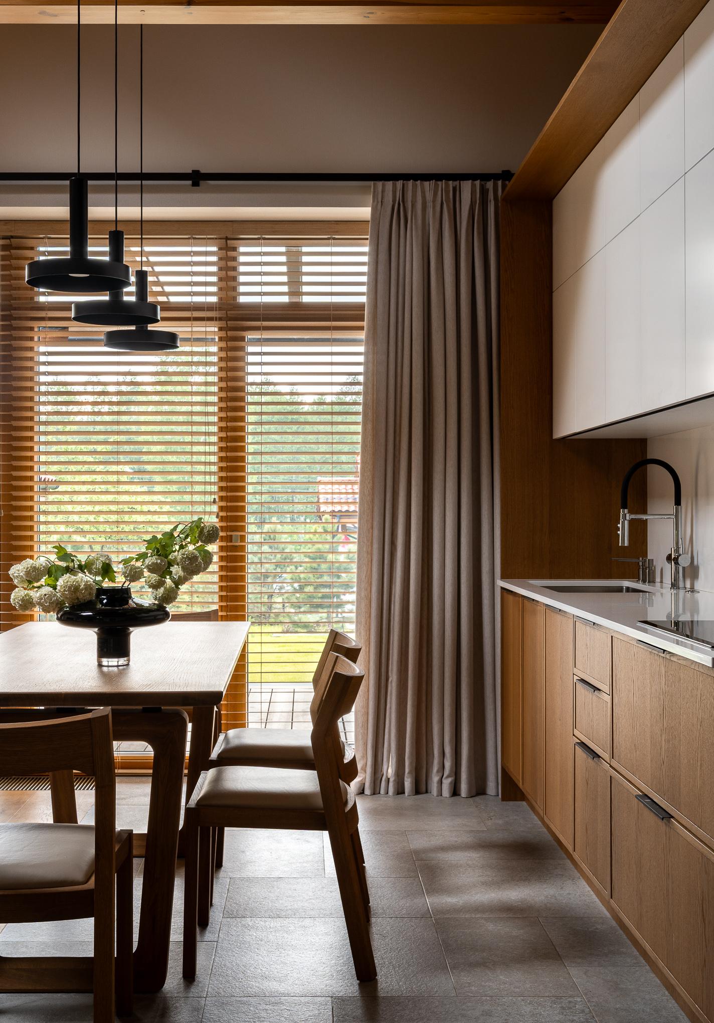 Кухня изготовлена на заказ. Столешница, шторы, жалюзи, стол и стулья, фабрика Geometree. Светильники, Arlight. Плитка на полу Brixstone, Imola Ceramica.