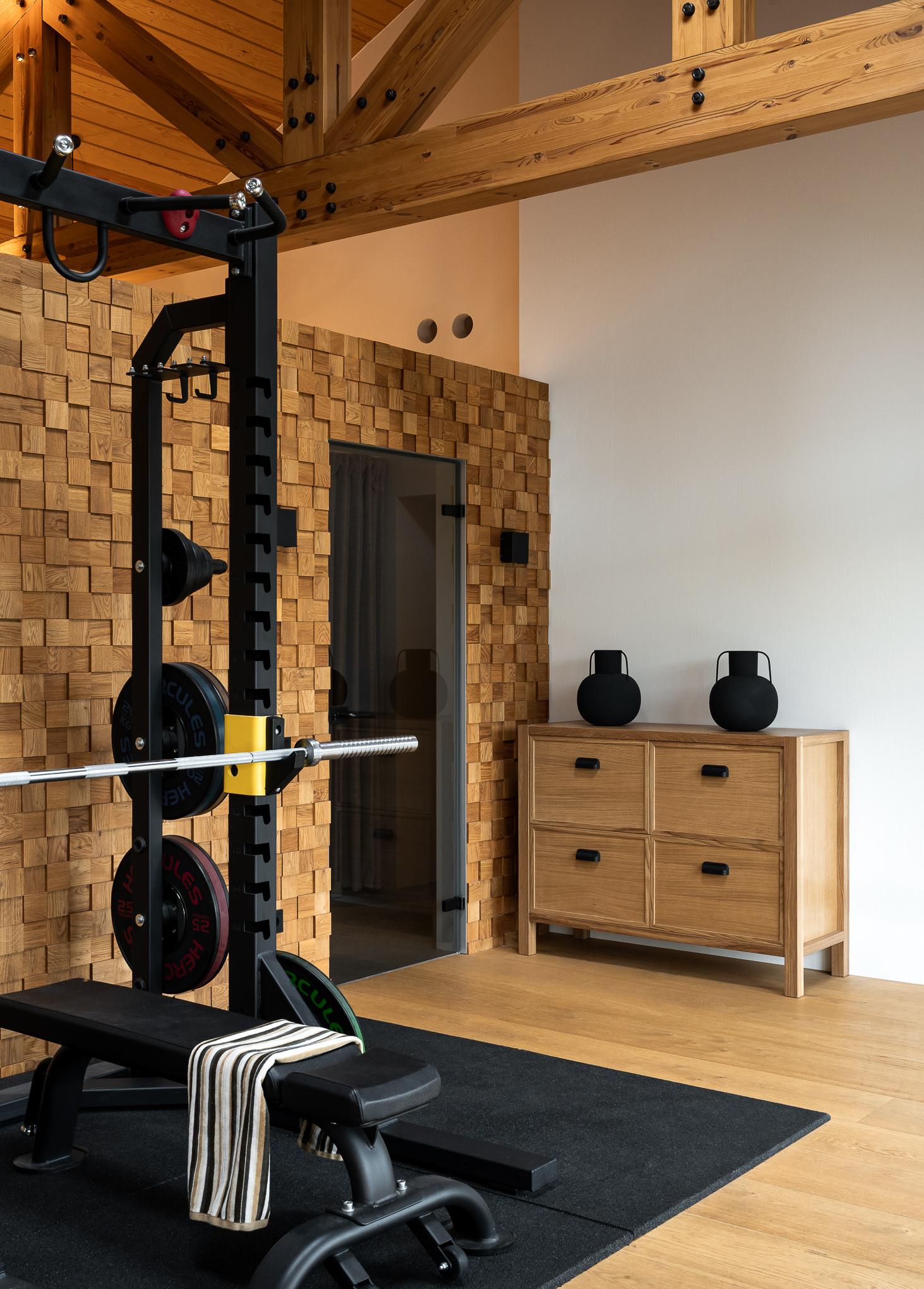 Заказчики — семейная пара, которая очень любит банные процедуры. Хозяин увлекается беговыми лыжами и любит силовые упражнения, так что почти все тренажеры в зале были изготовлены под заказ.