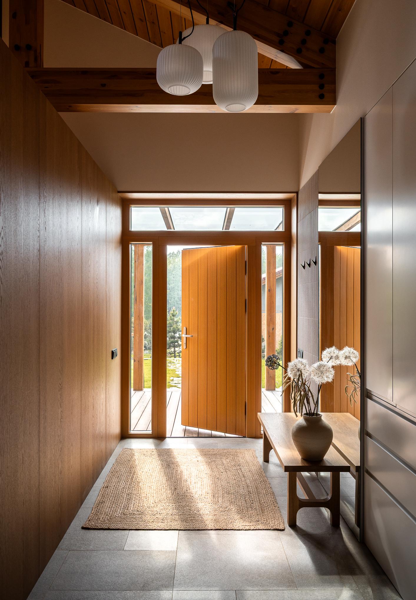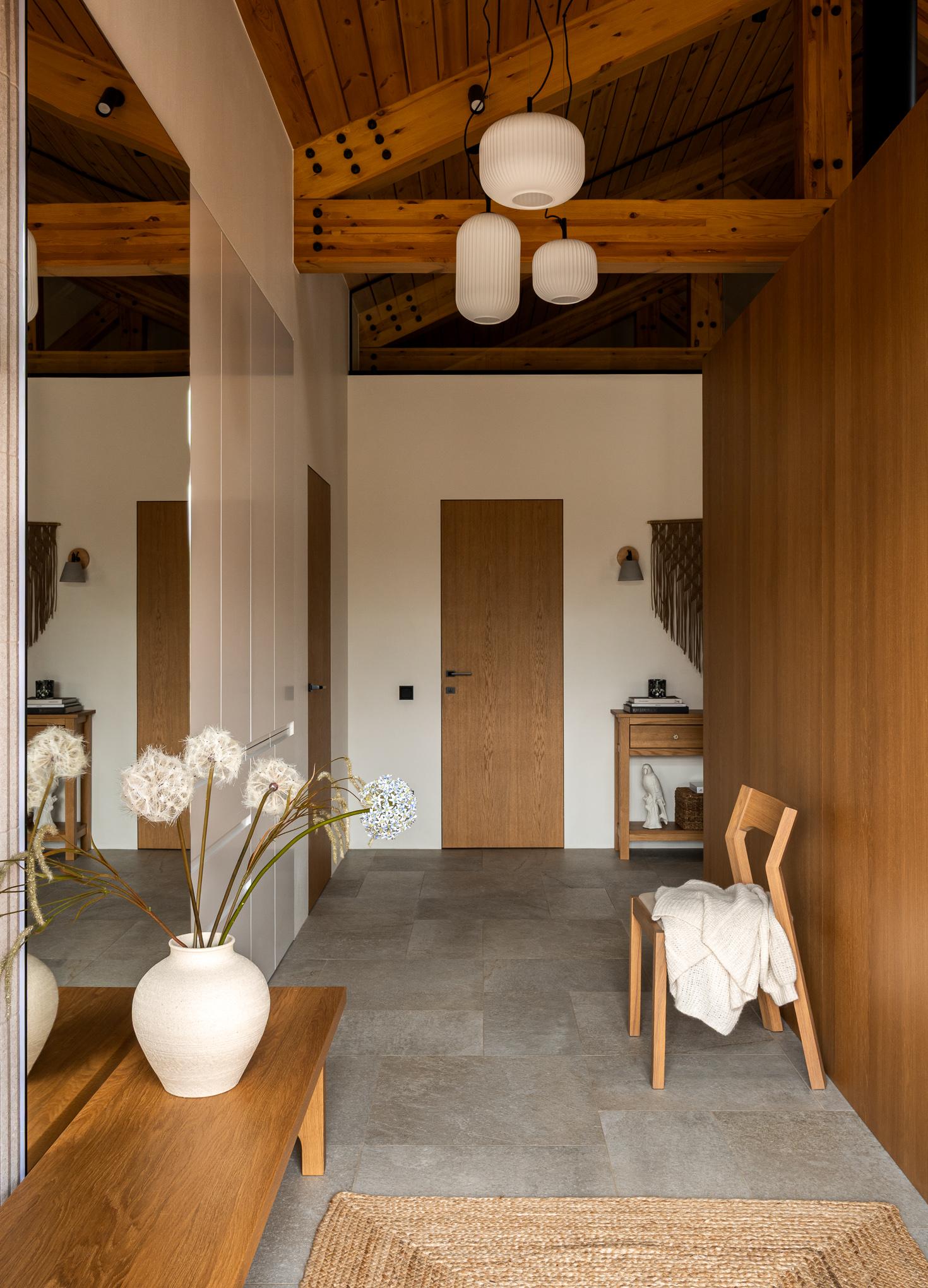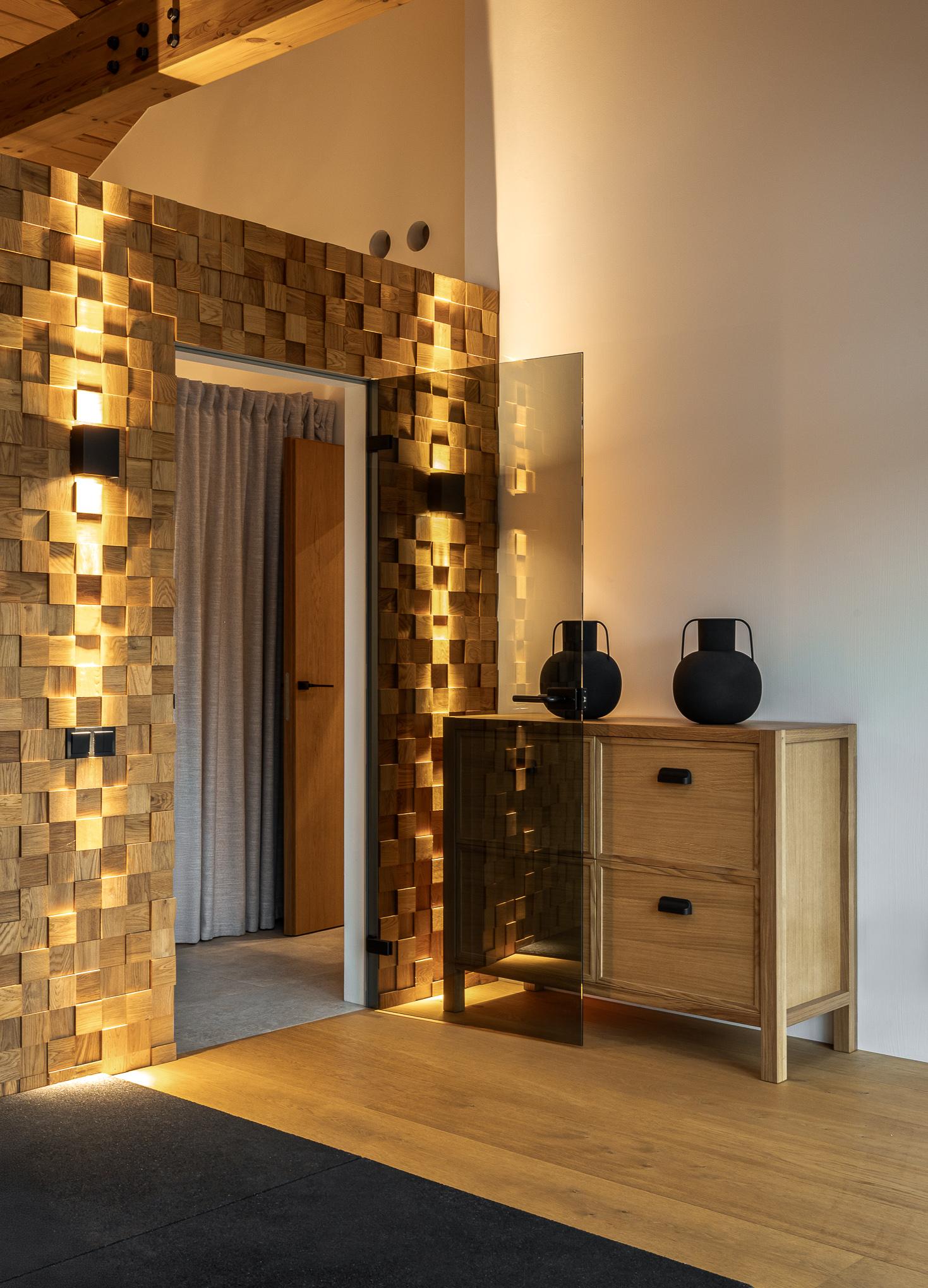 Стеновые панели из шпона, шкаф из МДФ и скамейка из массива дуба изготовлены на заказ. Плитка Brixstone, Imola Ceramica.