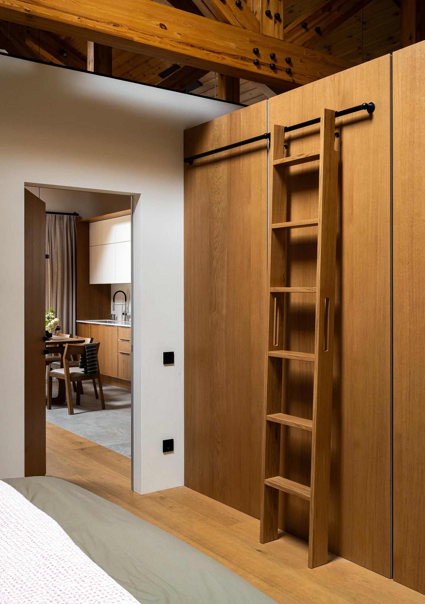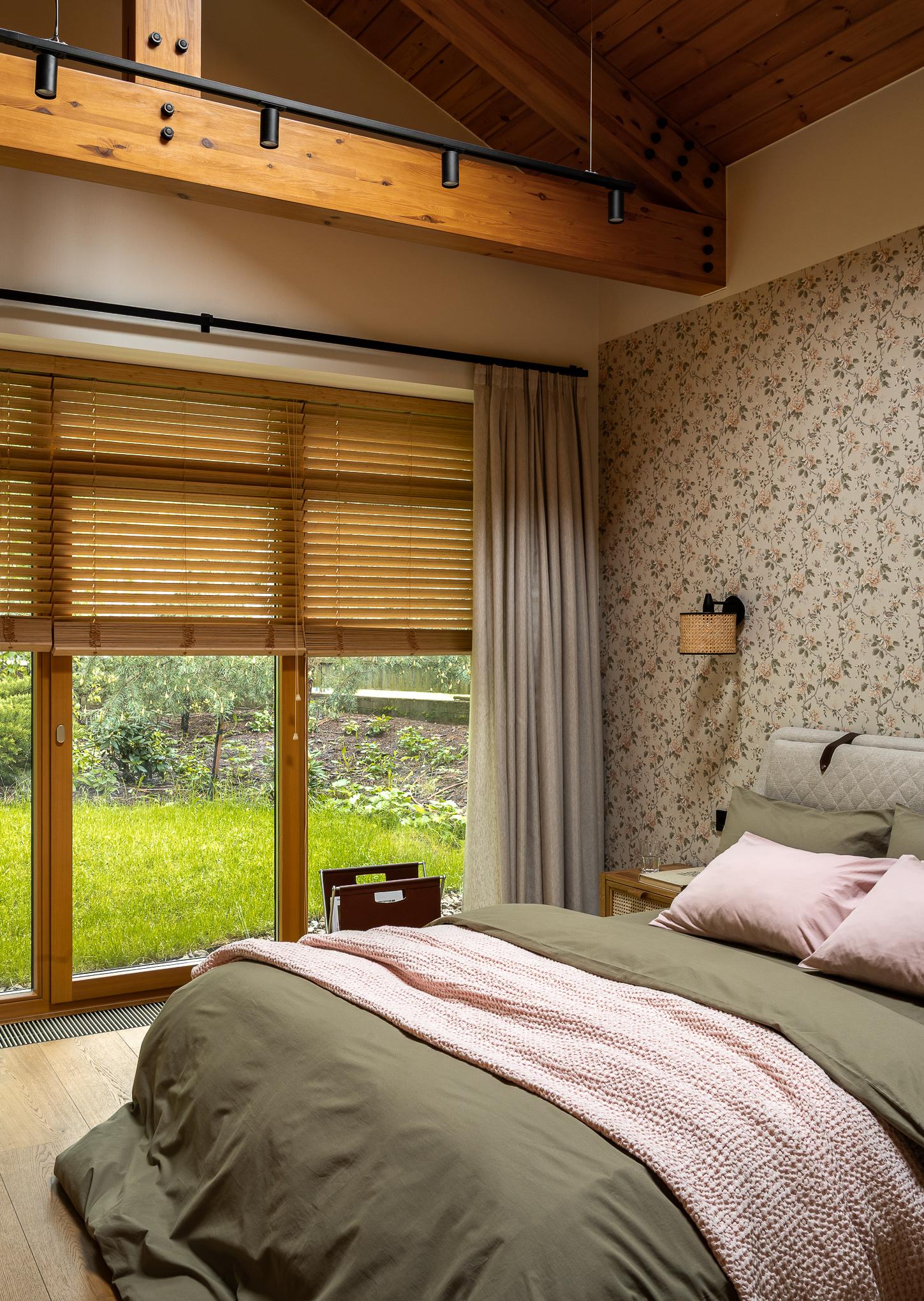 Над шкафом в спальне образовалась антресоль, куда можно подняться по лестнице. Фасады шкафа оформлены ротангом: «Мне нравится сочетание ротанга и дикого леса за окном», — говорит архитектор.