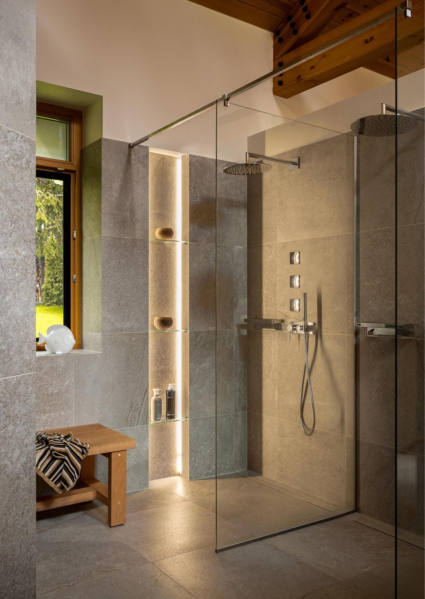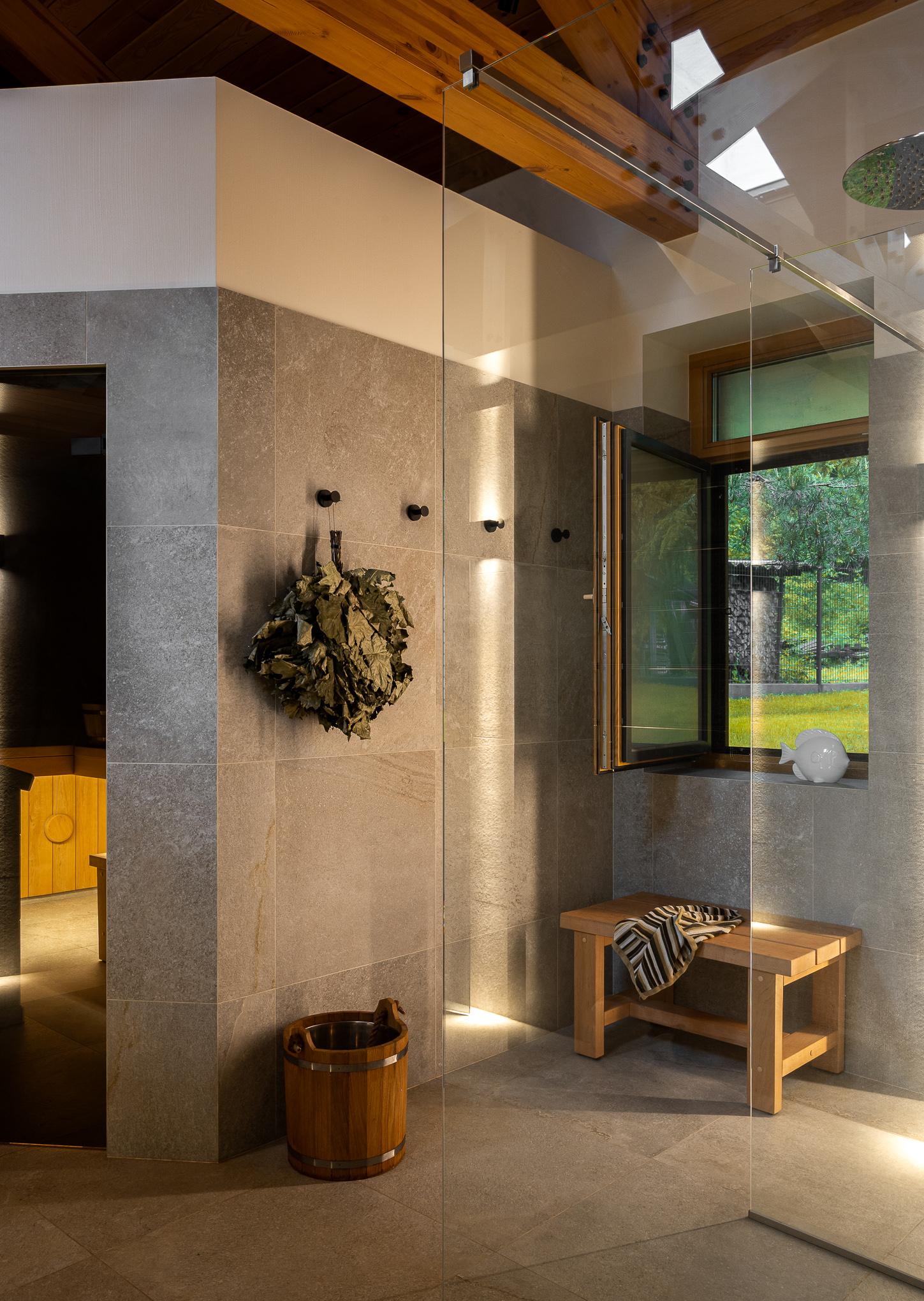 Заказчик хотел обустроить при бане две душевые — мужскую и женскую. «В этих зонах я добавила мягкую подсветку, чтобы после приглушенного света в бане не было резкого контраста», — говорит архитектор.