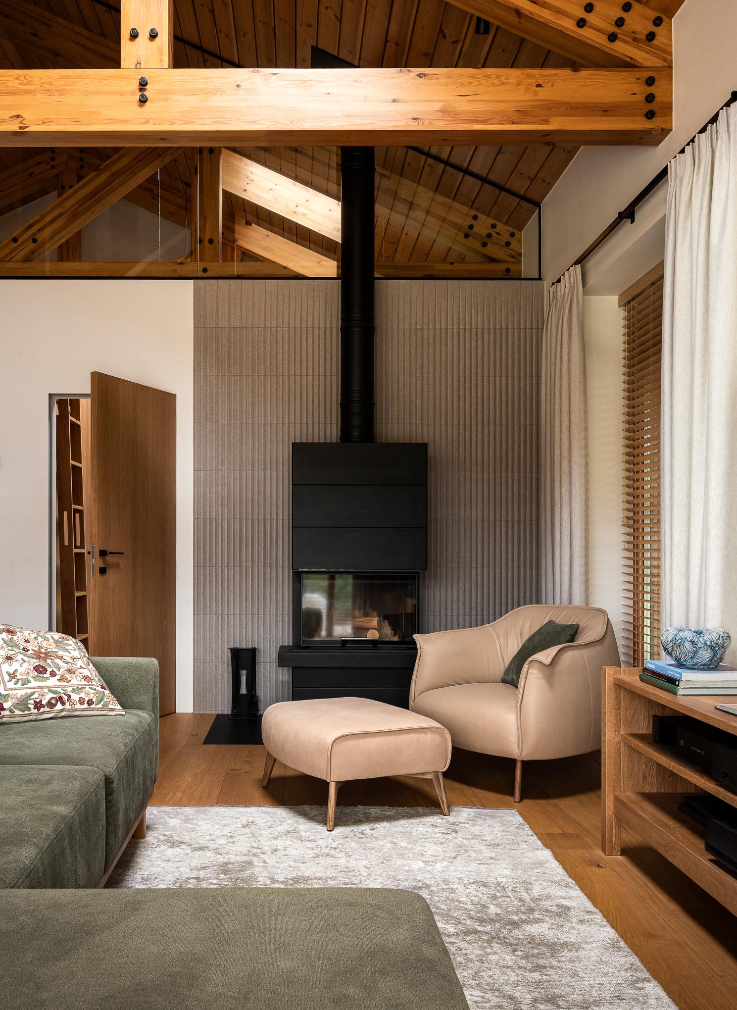 Плитка на стене, фабрика WOW. Камин, Romtop Cara. Кресло и пуф, Sofa Club.