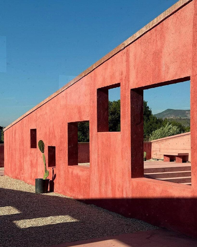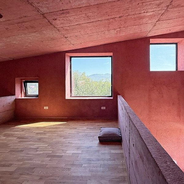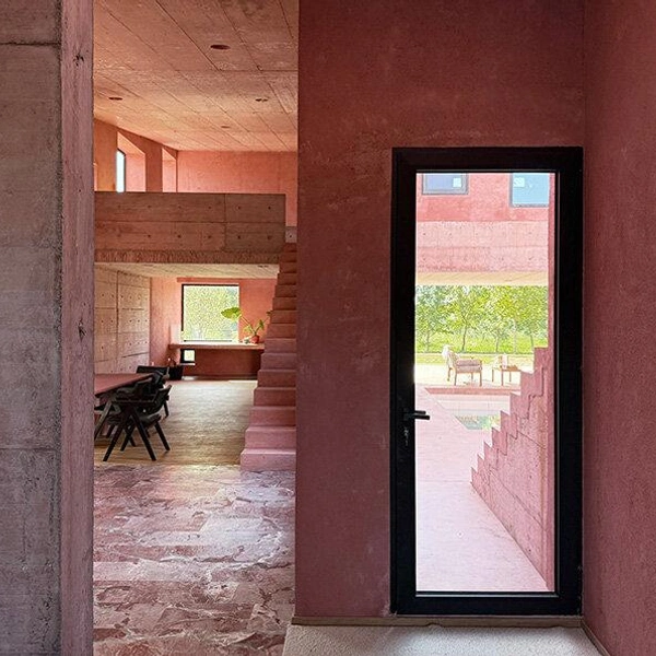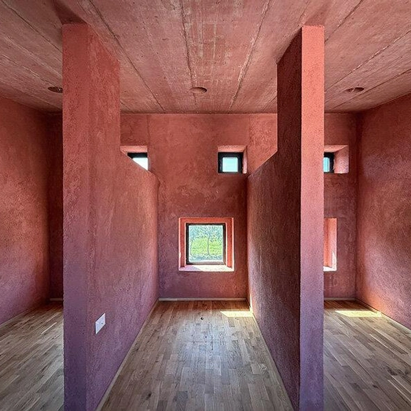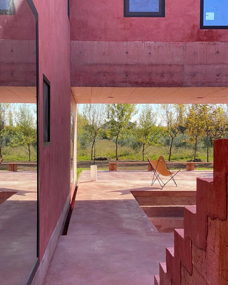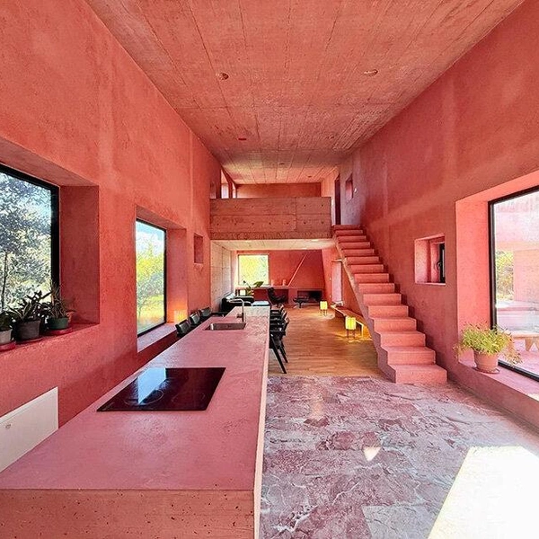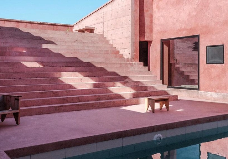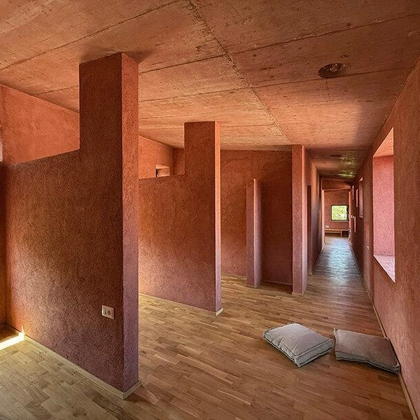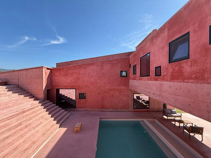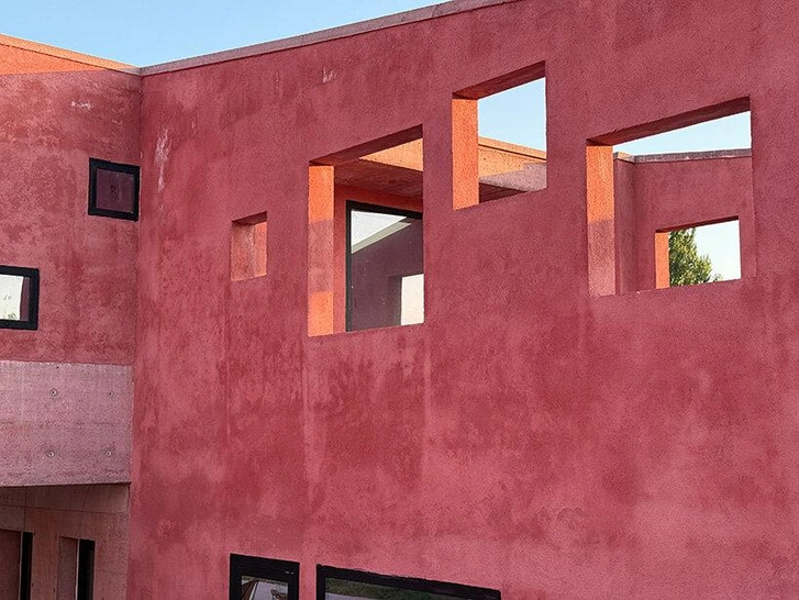 Стены дома — розовато-красного цвета. Это не краска, а натуральный оттенок штукатурки. В ее состав входят местная известь, песок, солома и казеин — белок из молока, который традиционно используют в строительстве в этих краях. В смесь добавили натуральный пигмент — окись железа.
