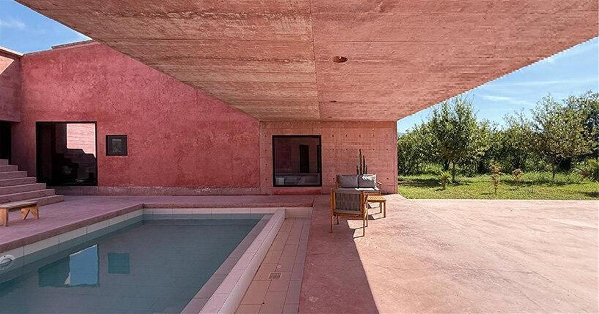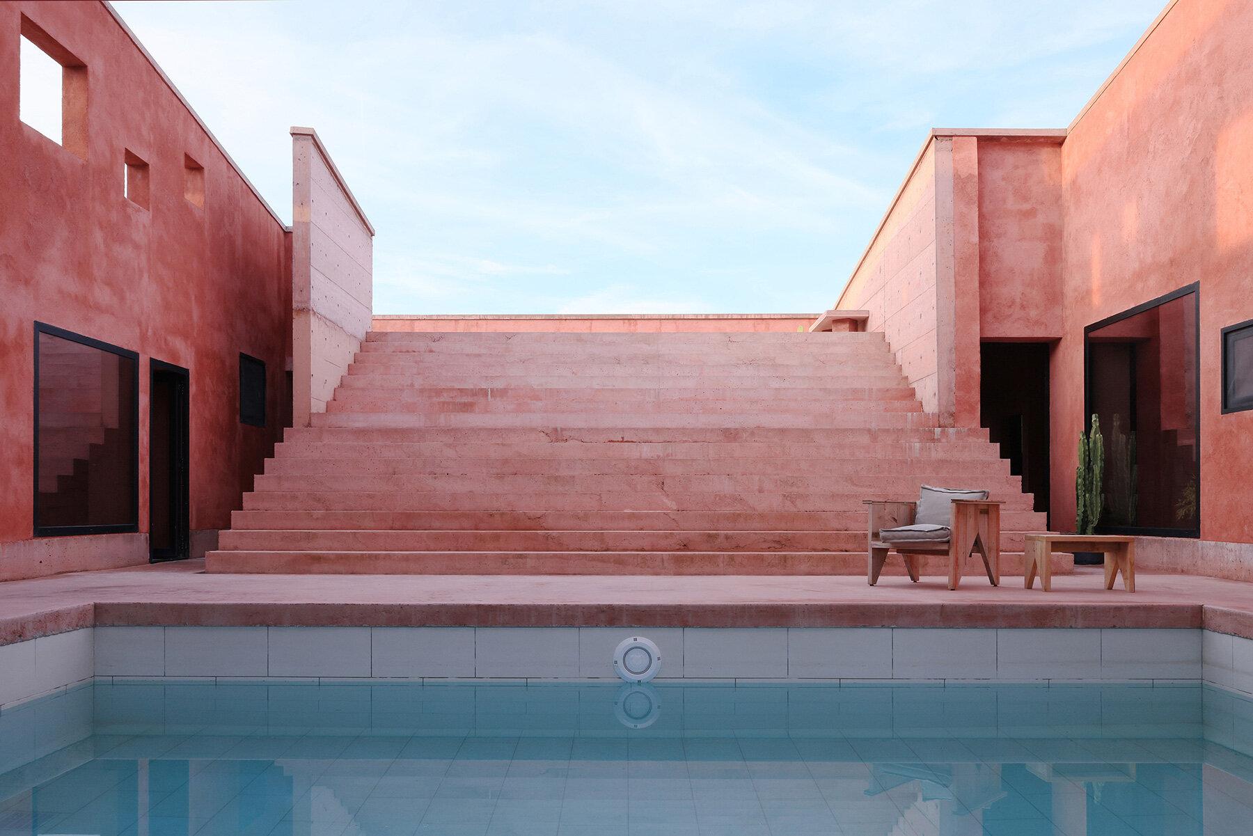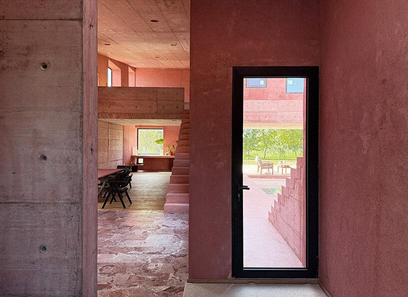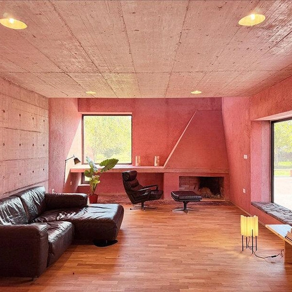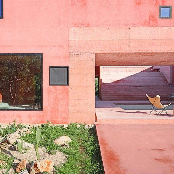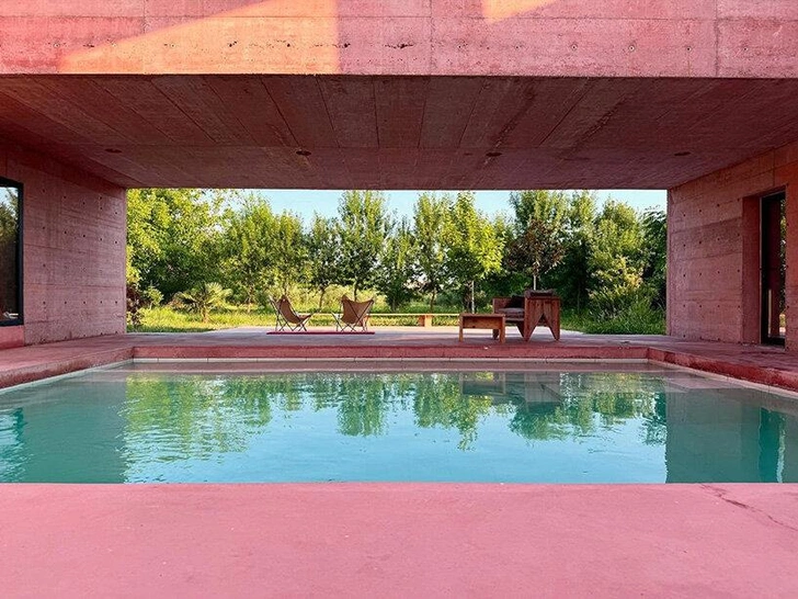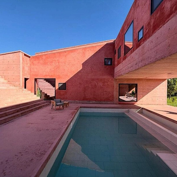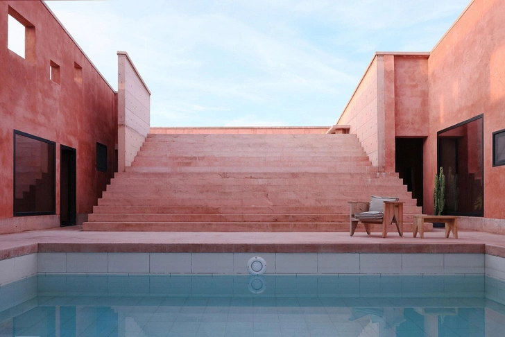Стены дома — розовато-красного цвета. Это не краска, а натуральный оттенок штукатурки. В ее состав входят местная известь, песок, солома и казеин — белок из молока, который традиционно используют в строительстве в этих краях. В смесь добавили натуральный пигмент — окись железа.