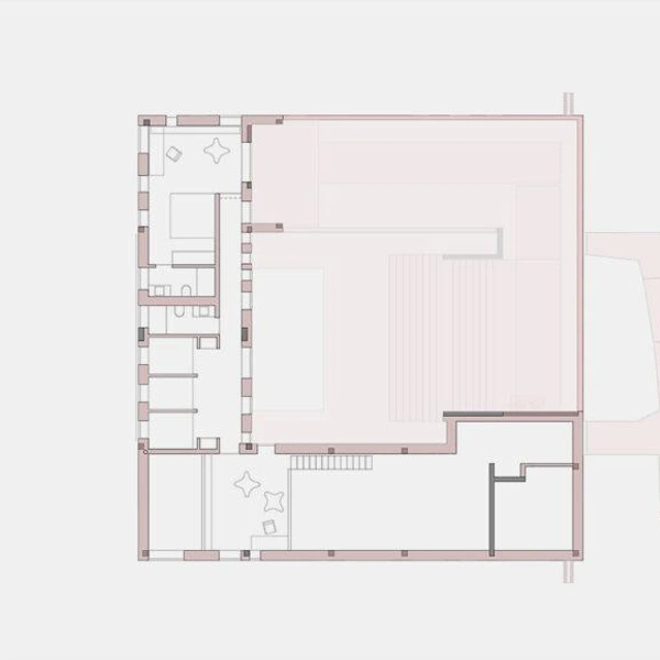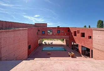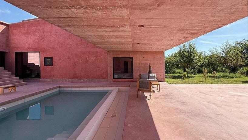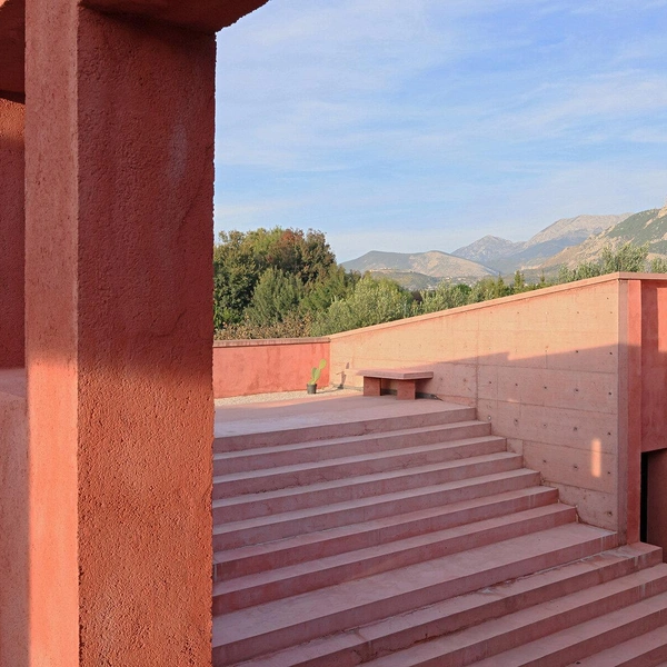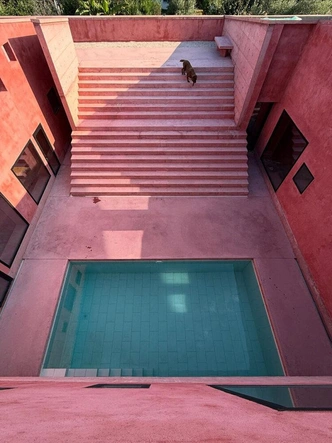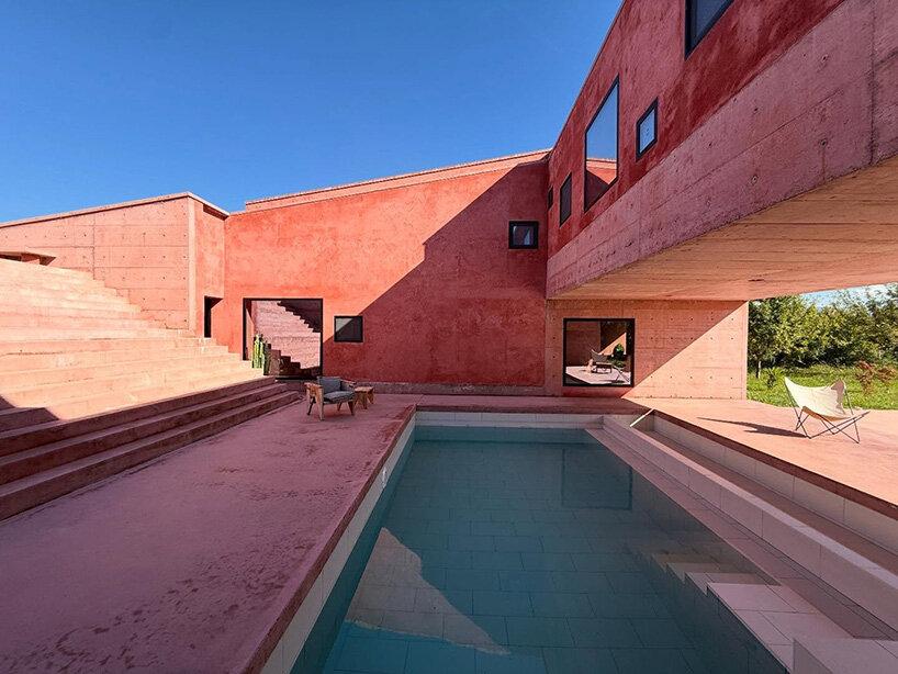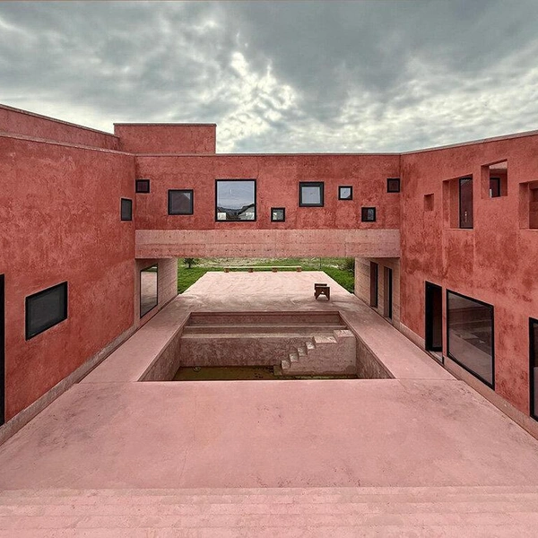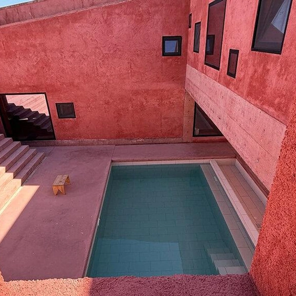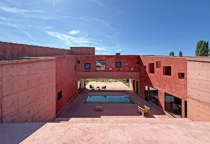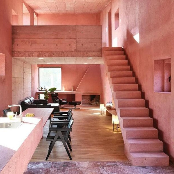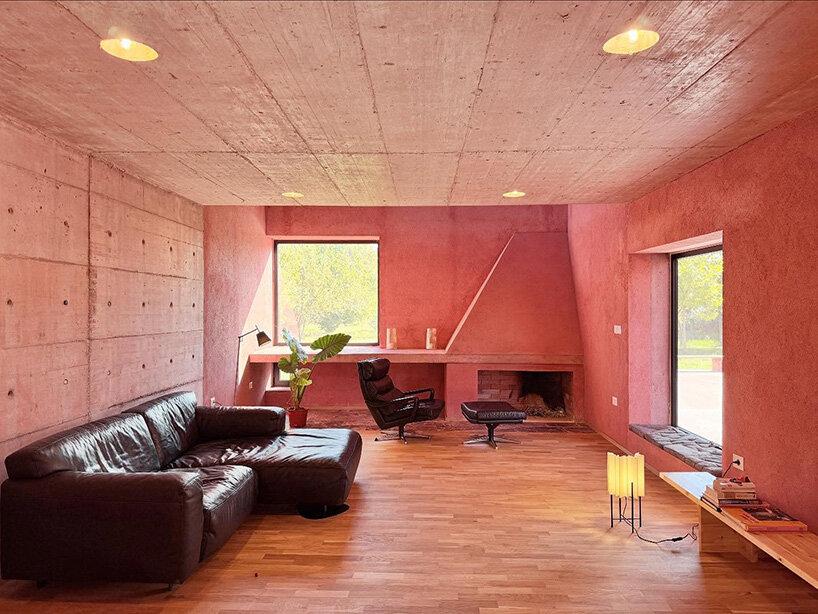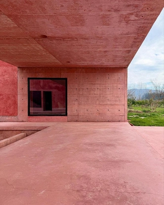 Стены дома — розовато-красного цвета. Это не краска, а натуральный оттенок штукатурки. В ее состав входят местная известь, песок, солома и казеин — белок из молока, который традиционно используют в строительстве в этих краях. В смесь добавили натуральный пигмент — окись железа.