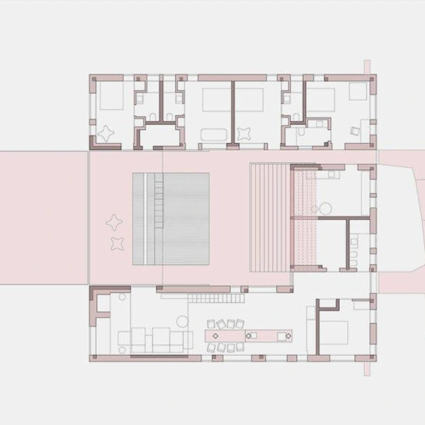 Дом площадью 350 квадратных метров построен вокруг квадратного двора. Внутри этого двора — бассейн. Такая планировка не случайна: двор стал настоящим сердцем дома, местом, где пересекаются все маршруты, отдыхают, собираются вместе и смотрят на сад.