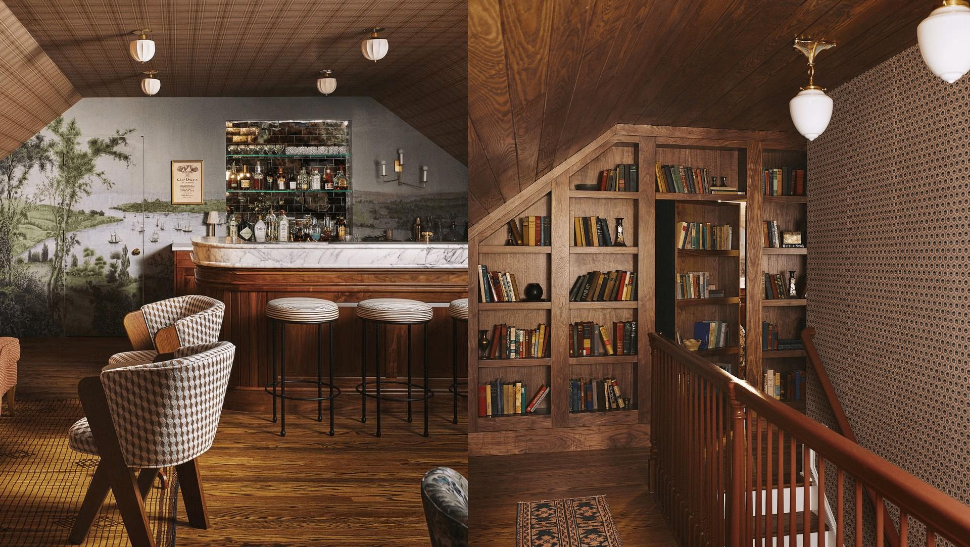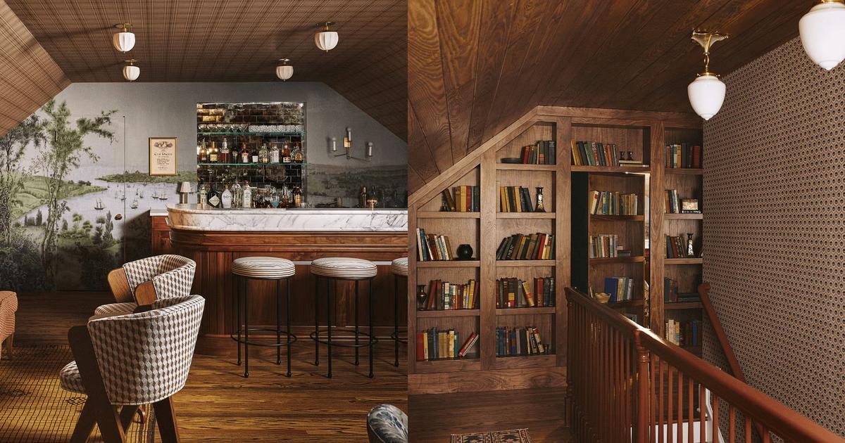 Необычным пожеланием клиентов стало создание на чердаке бара в стиле спикизи 1920-х с потайным входом. Дизайнер приняла вызов, организовав сложную доставку мебели через разобранный лестничный пролет.