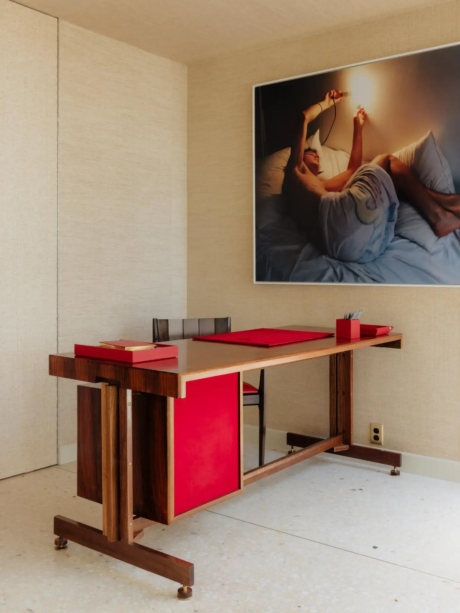 В кабинете Мортона стоит итальянский стол 1960-х годов, обитый алой кожей. Дизайнер подобрал к нему кожаный письменный комплект швейцарской компании Lucrin. Над столом фотография Джесси Гувейи.