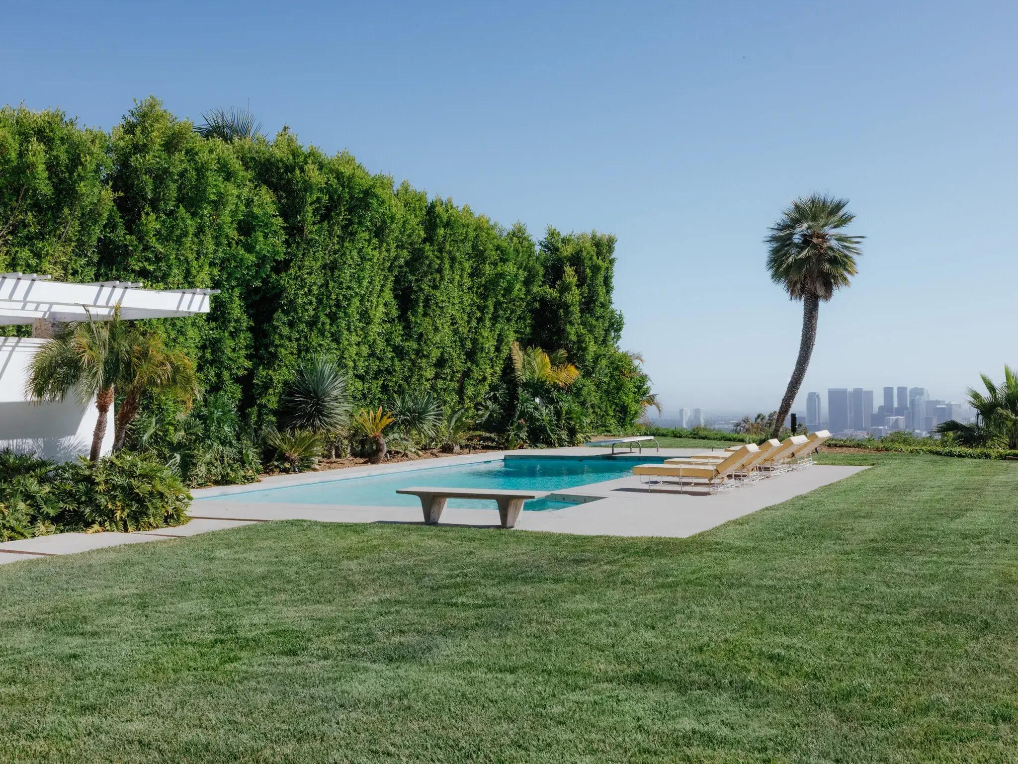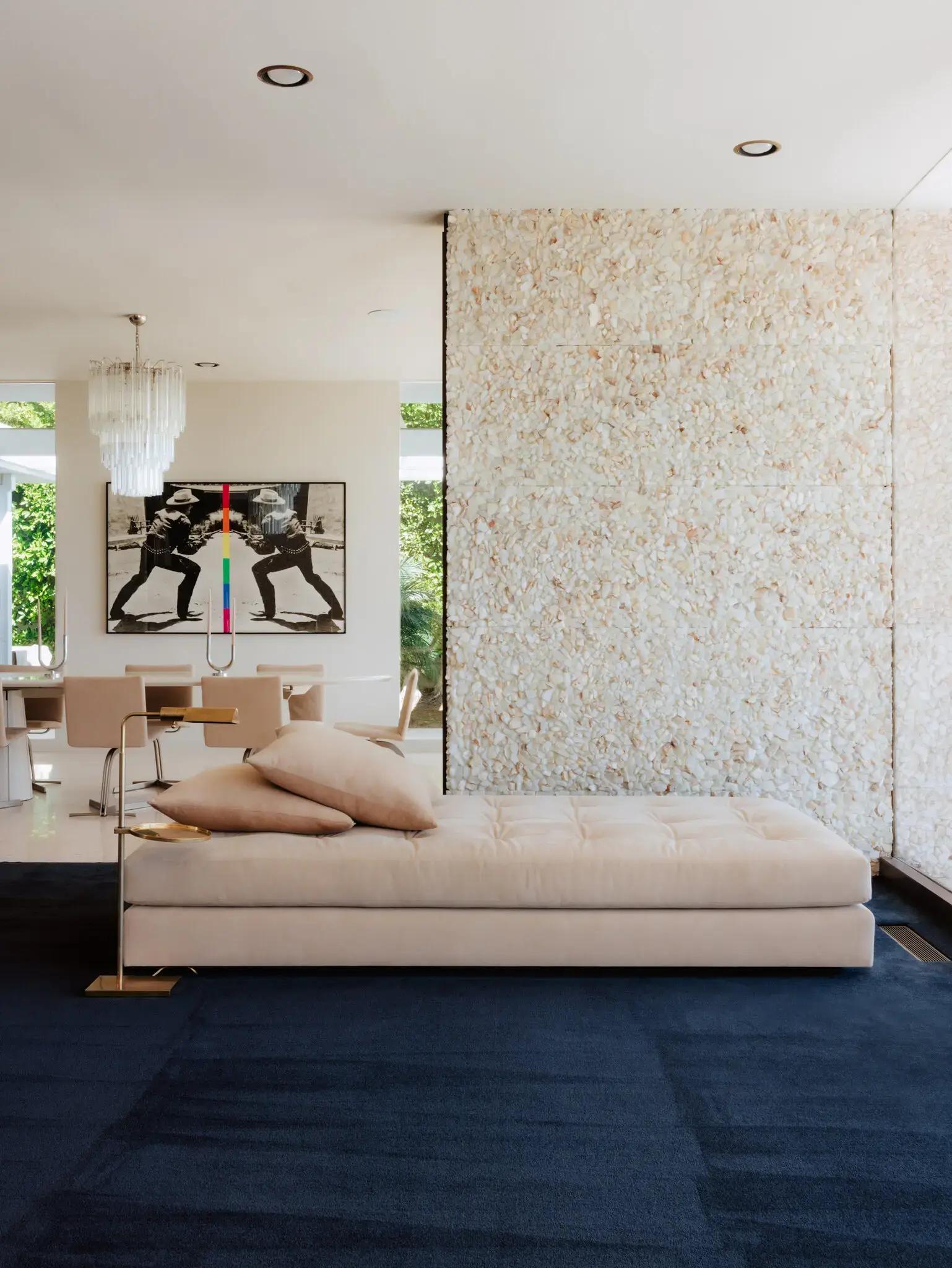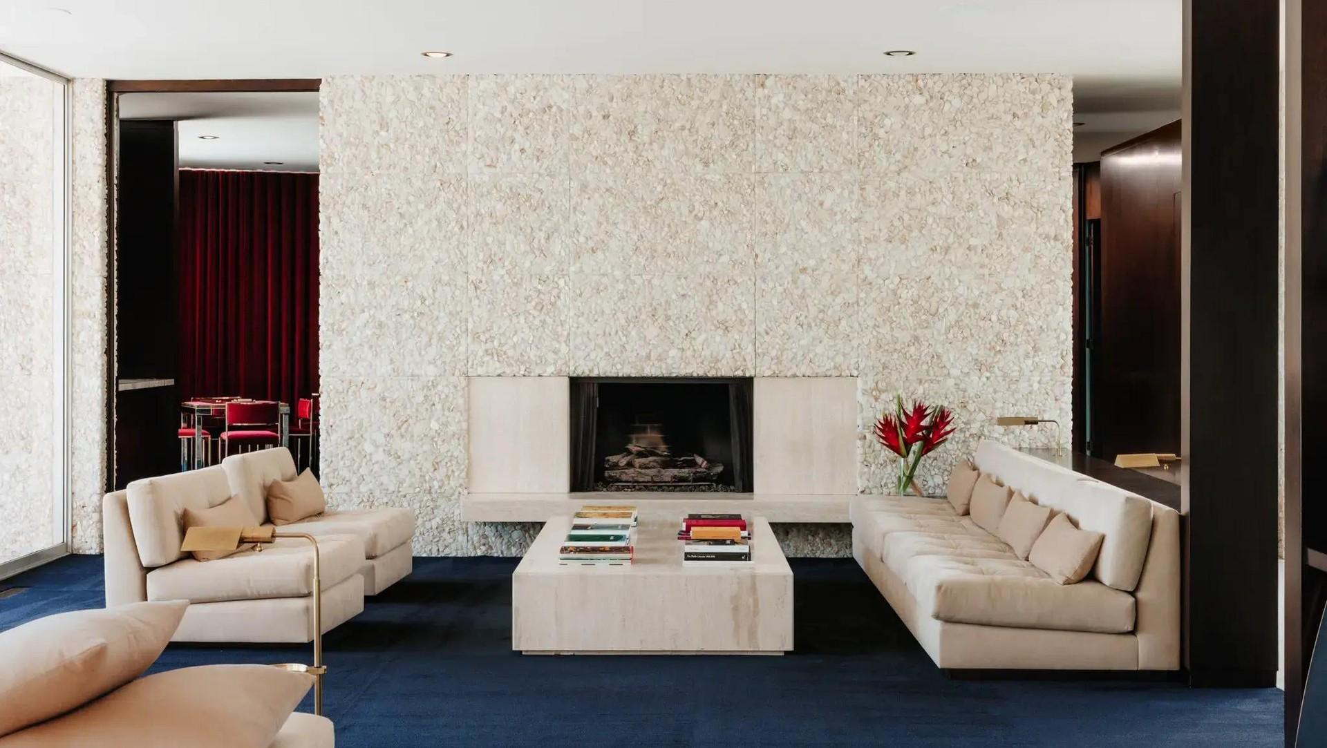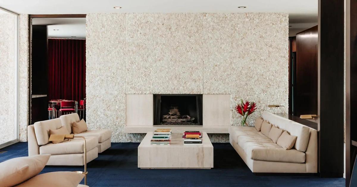 Дом ориентирован вокруг гостиной, ограниченной с одного конца стеной с камином, которую в 1950-х годах покрыли кусками белого кварца. Дизайнер заказал прямоугольный журнальный столик, отделанный светлым травертином и окружен низкими диванами, обитыми замшей цвета слоновой кости.