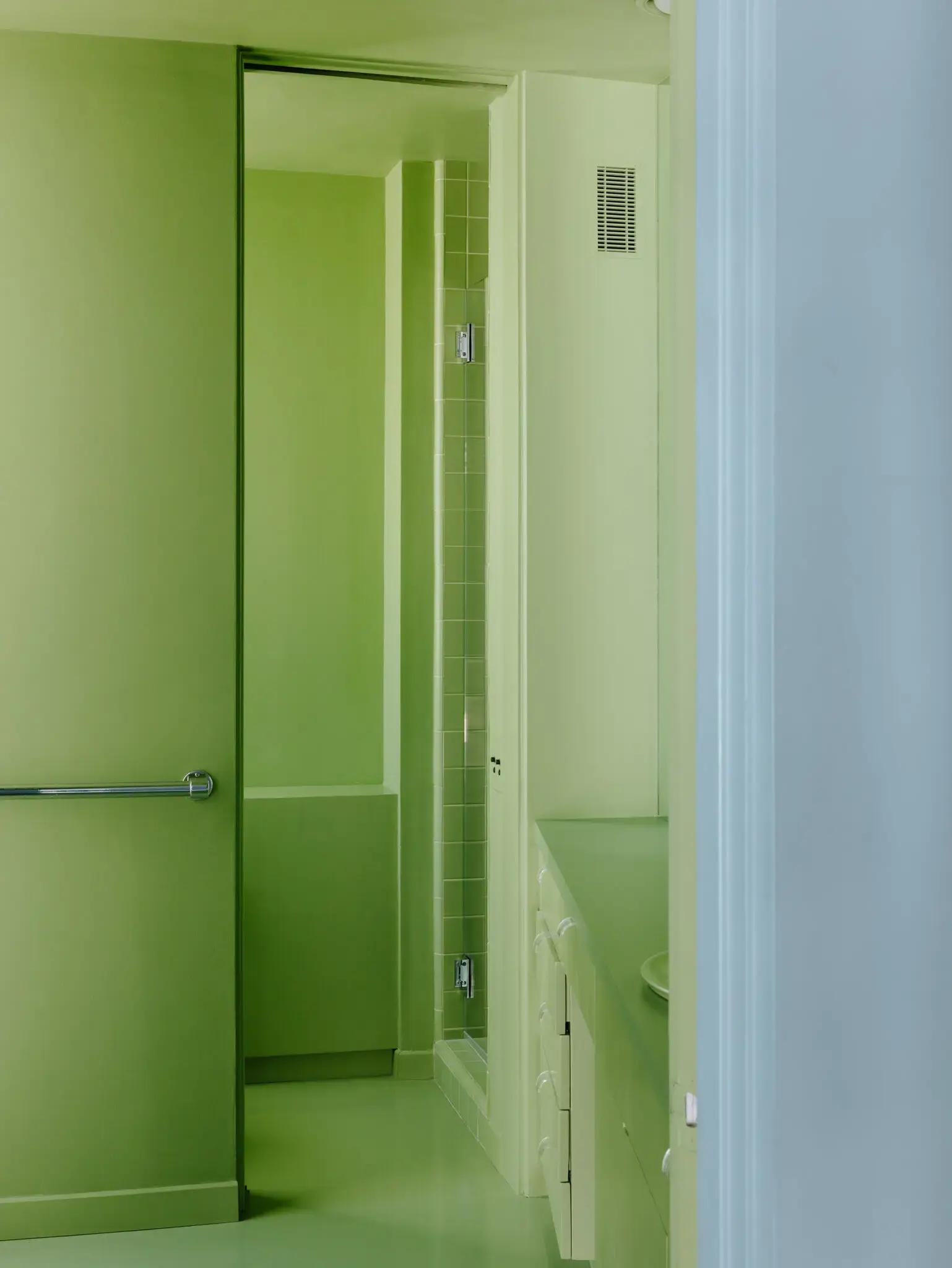 Санузел при гостевой комнате была выложен плиткой фисташкового цвета. Дизайнер подобрал остальные детали и сантехнику к ней в тон и приобрел винтажную ванну 1950-х годов нужного цвета.