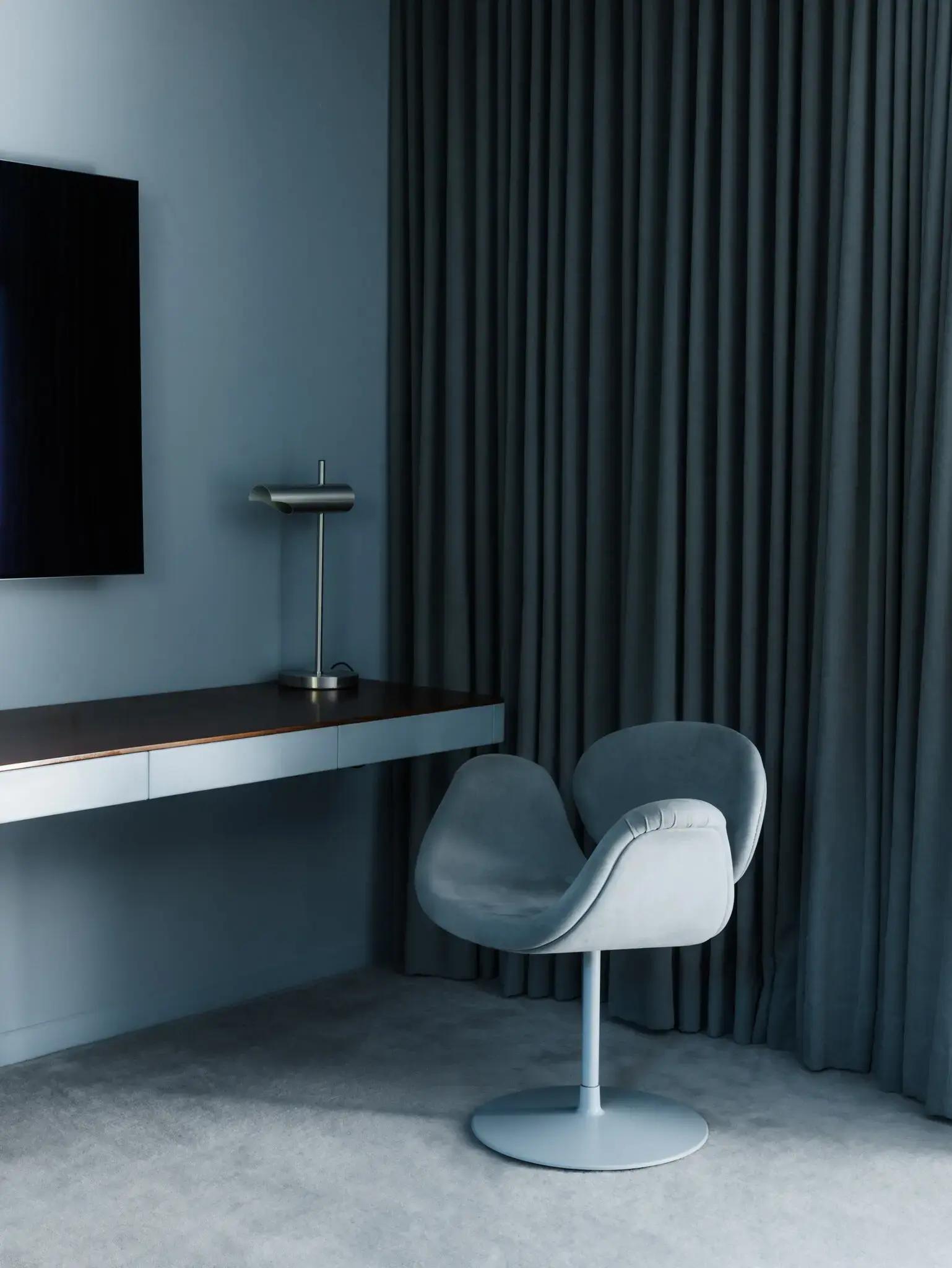 Билли Коттон покрасил соседнюю гостевую комнату в прохладный оттенок голубого. Кровать из обожженного ореха 1955 года дизайна Джо Понти украшена винтажными динамиками, встроенными в прикроватные тумбочки, а раздвижные стеклянные двери ведут на террасу для медитаций, обсаженную фикусами, где установлены бетонный стол и стулья, напоминающие об эпохе модернизма.