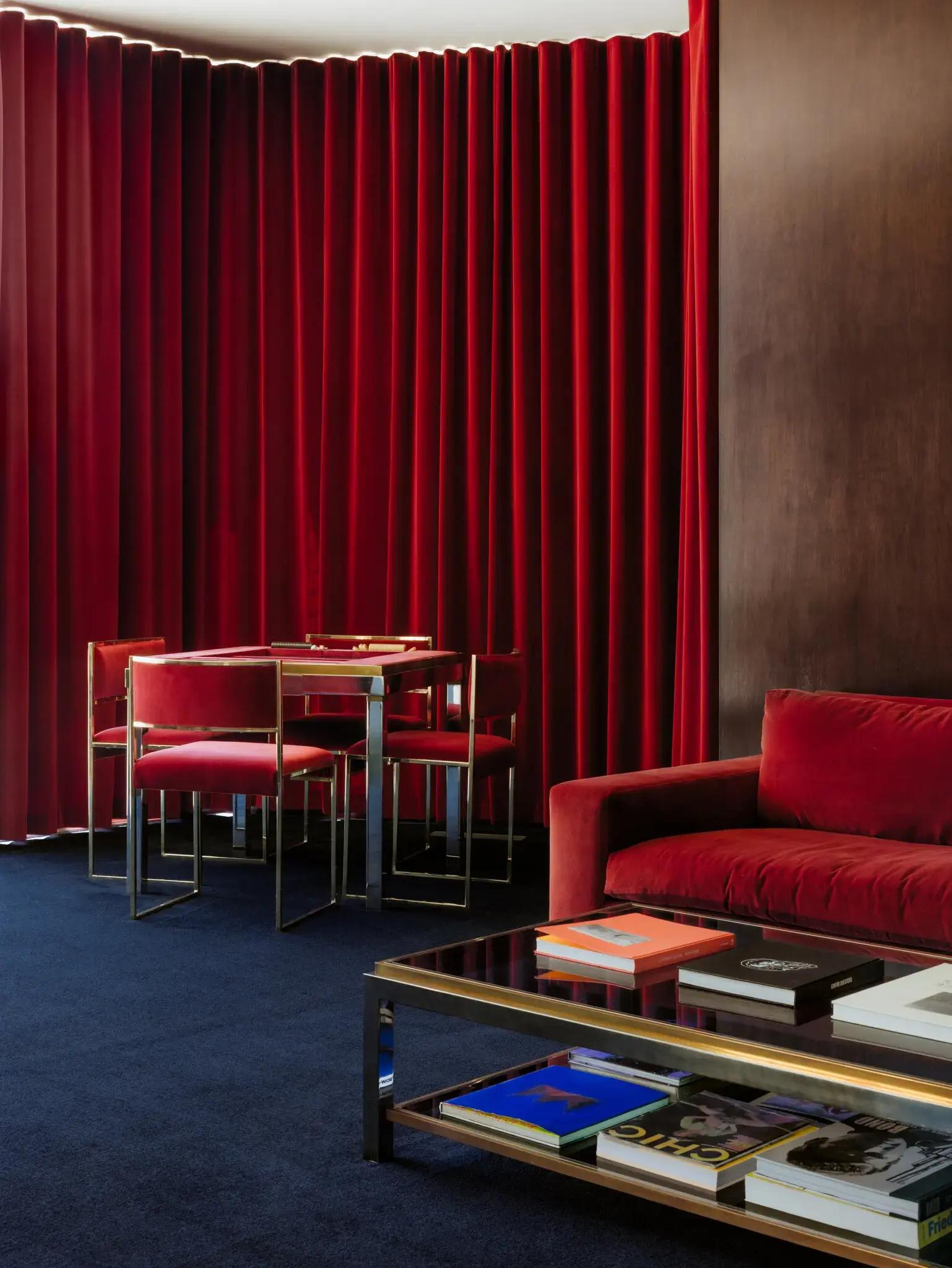 Шторы сделаны из бордового бархата Scalamandrе, той же тканью перетянули стулья и поверхность стола для игры в нарды от Вилли Риццо.