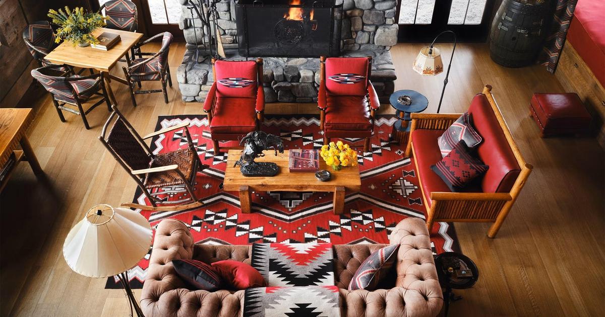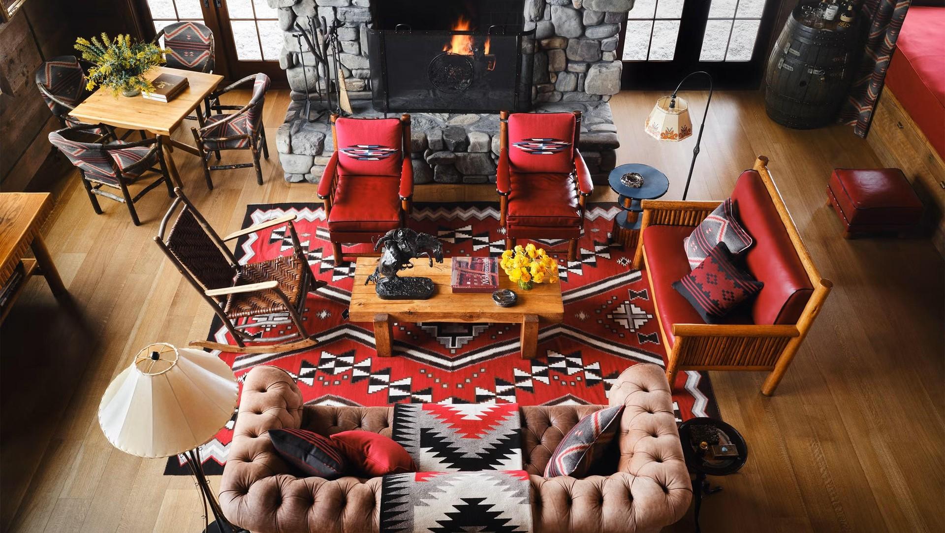 Камин в гостиной облицован речным камнем. Диван, Ken Fulk. Винтажные кресла Томаса Молсворта. Маленький диванчик Wyoming Furniture Company с подушками Ralph Lauren. Ковер навахо 1920-х годов.