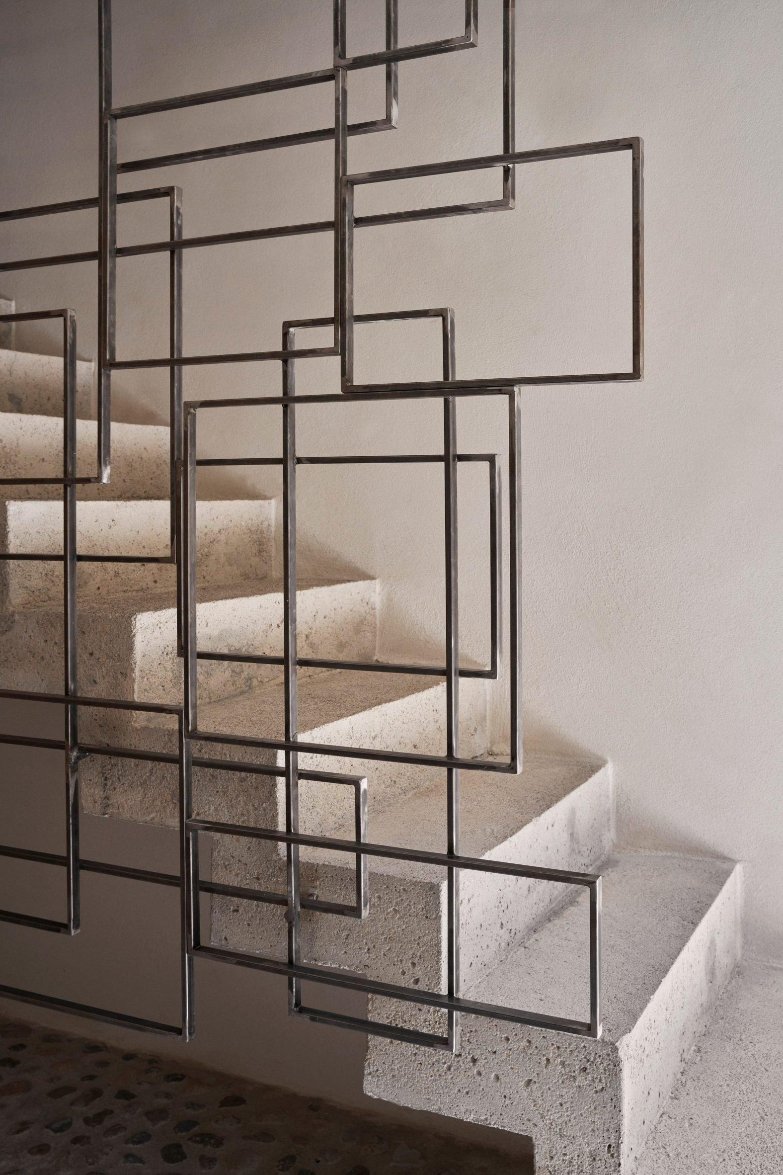 Этажи соединяет между собой новая монолитная бетонная лестница лестница — настоящая достопримечательность этого дома. Она украшена перегородкой из металла с геометрическим узором, изготовленной местным мастером по металлу Алехандро Берконски. «Лестница выступает в роли скульптурного, связующего элемента, связывая воедино все три уровня дома и отдавая дань уважения местному мастерству», — говорит Джули.