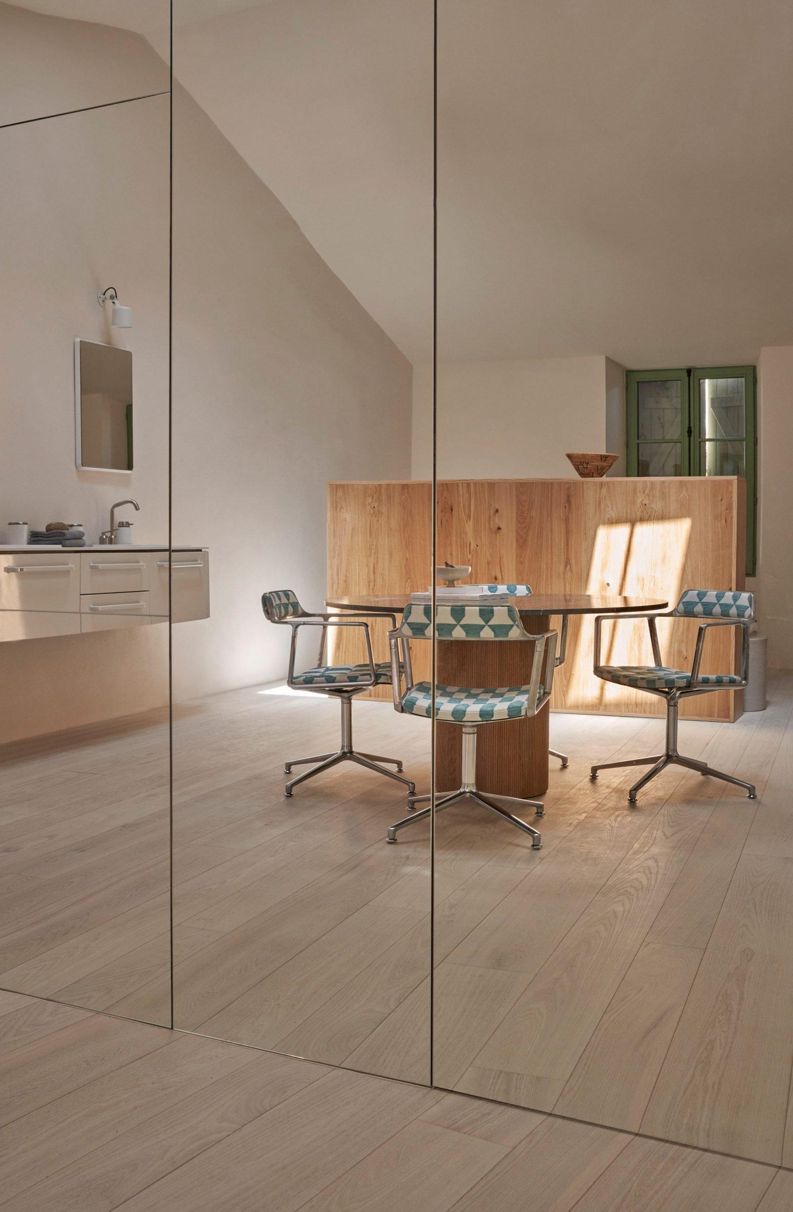 На кухне второго этажа центральное место отведено кухонному острову Vipp V3 с фасадами из анодированного алюминия и столешницей из нержавеющей стали. А круглый обеденный стол дополняют вращающиеся кресла Vipp в веселой обивке из ткани Pierre Frey, которая гармонирует с зелеными окнами.