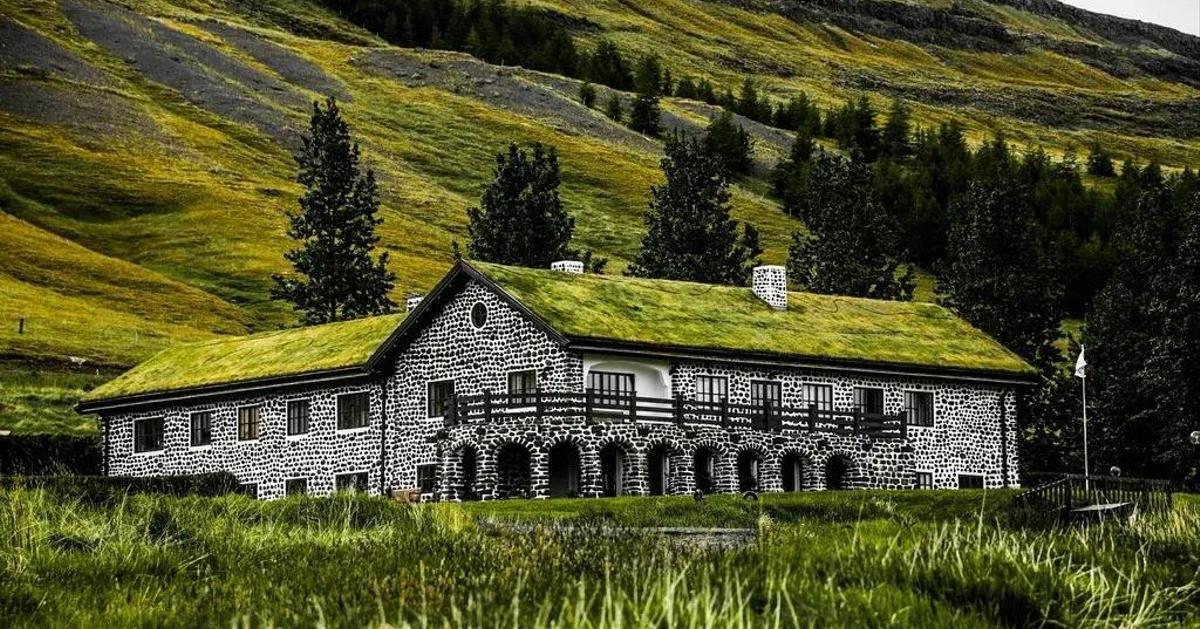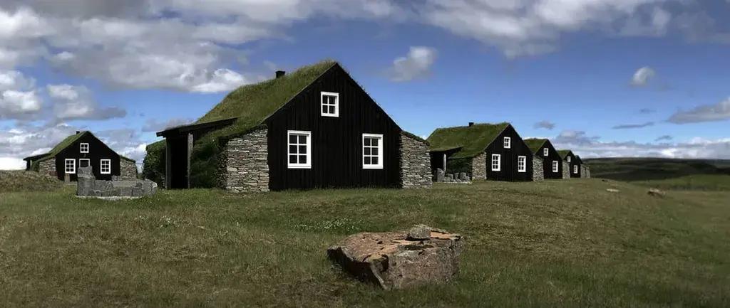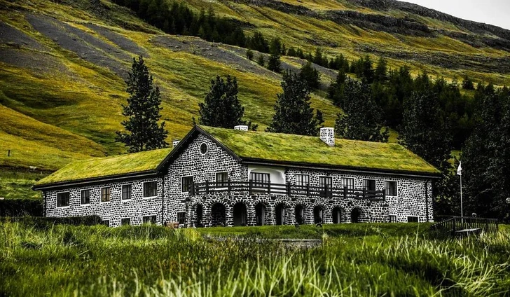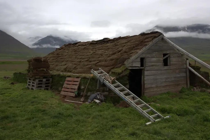 Дерновые дома в Исландии, или torfbæir, строили так: на каменный фундамент укладывали блоки дерна — плотные куски земли с корнями травы, вырезанные из болот. Между ними прокладывали плавник (дерево, выброшенное морем) — единственный доступный лесоматериал. Толстые стены удерживали тепло геотермальных источников, узкие окна минимизировали потери, а зеленая крыша работала как изолятор и камуфляж.