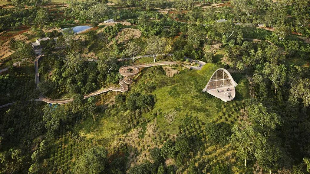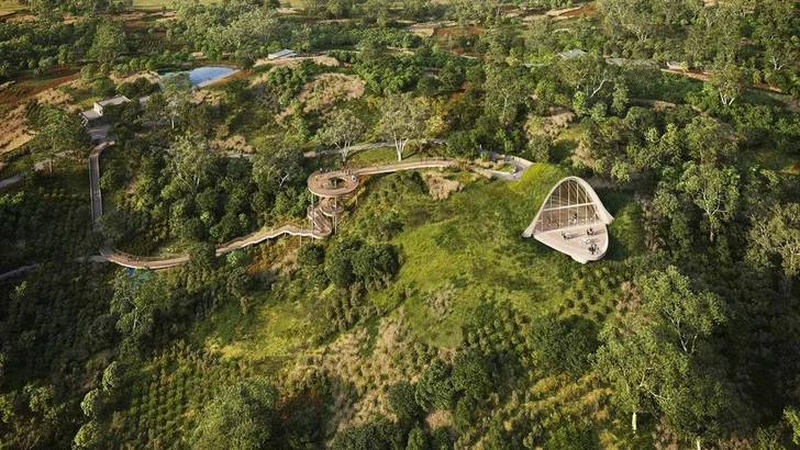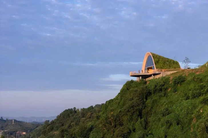 MVRDV построили смотровую площадку в холмах под Чэнду. Деревянный арочный павильон частично заглублен в землю и покрыт дерном. Он повторяет форму холма, а через телескопическую арку открывается вид на окрестности. Прямая отсылка к идее «ландшафт как укрытие».