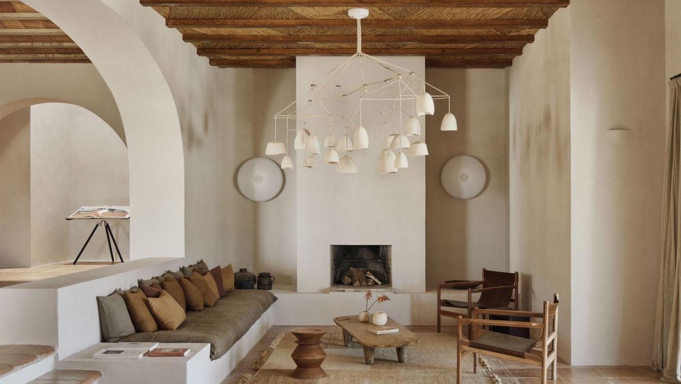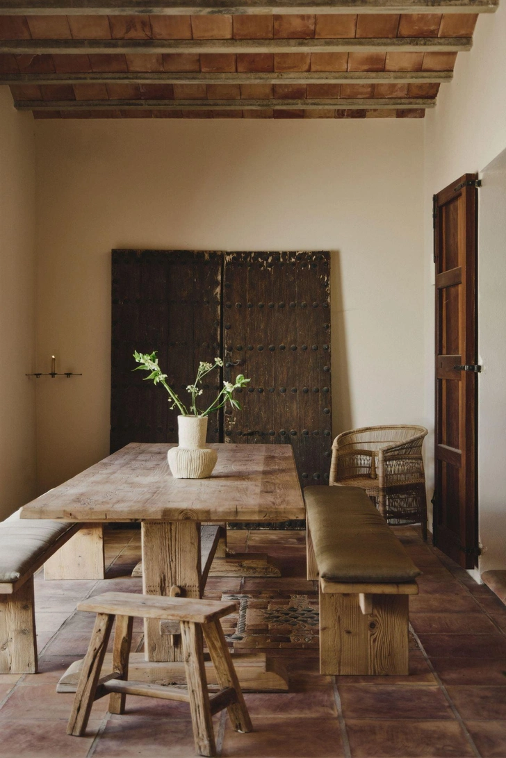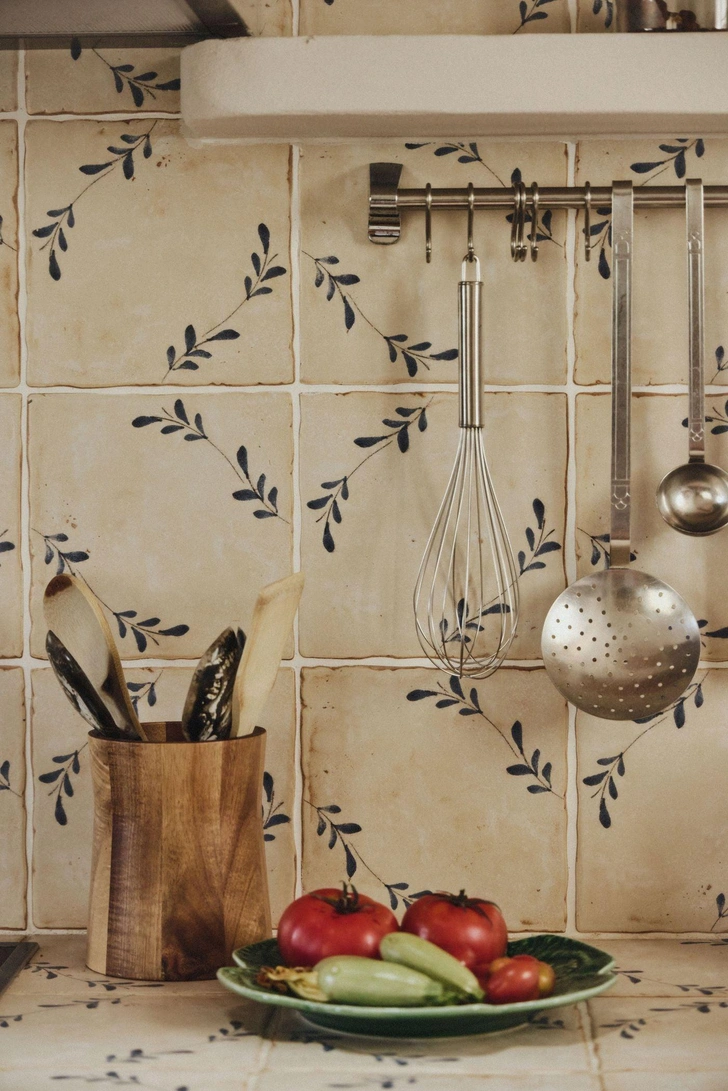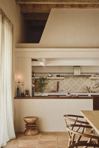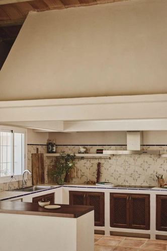 Дизайнеры тесно сотрудничали с местными ремесленниками, чтобы внести в интерьеры тепло ручной работы. Одна из ярких деталей — балочный потолок в гостиной, который создали, чтобы сделать пространство выше. Ритм балок перекликается с арочными потолками в соседней столовой. Традиционная плитка на кухне расписана синими ветвями оливы.