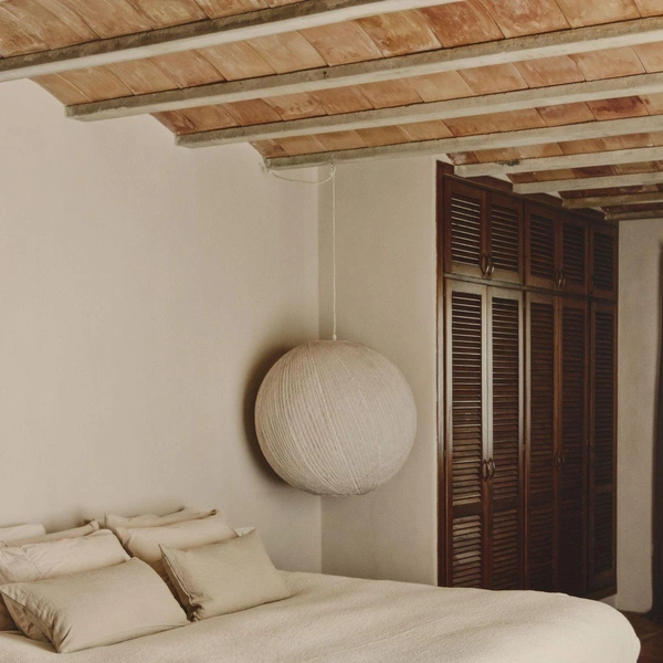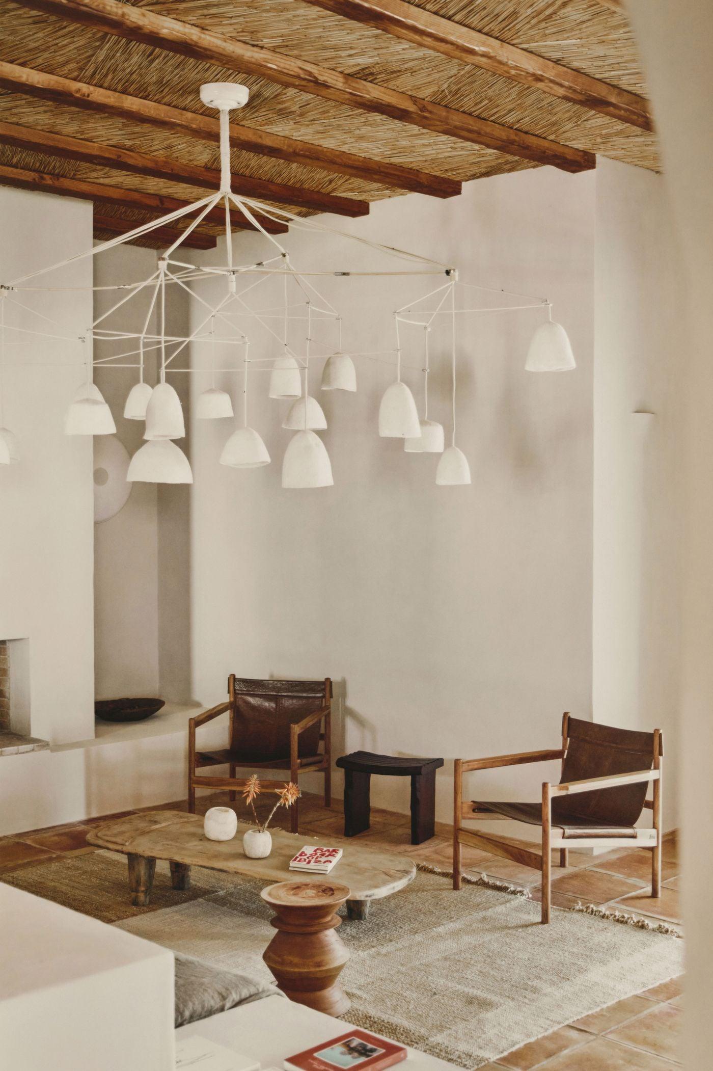 Войлочные подвесные лампы разных размеров свободно развешаны в гостиной, придавая интерьеру скульптурную мягкость, а деревянные столы ручной работы и льняная обивка создают в доме ощущение естественности.