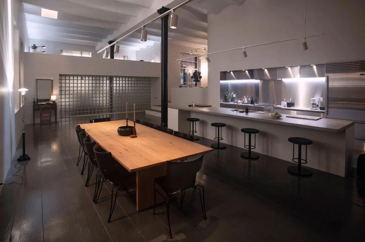 Так вышло, что оригинальный интерьер квартиры отражен всего на нескольких снимках. «Интерьер квартиры Кеннеди называли немного студенческой. Мы постарались придать ей более стильный вид, используя разные поверхности, такие как бетонные столешницы, стеклянные блоки, нержавеющую сталь и хромированные элементы», — комментирует команда по дизайну.