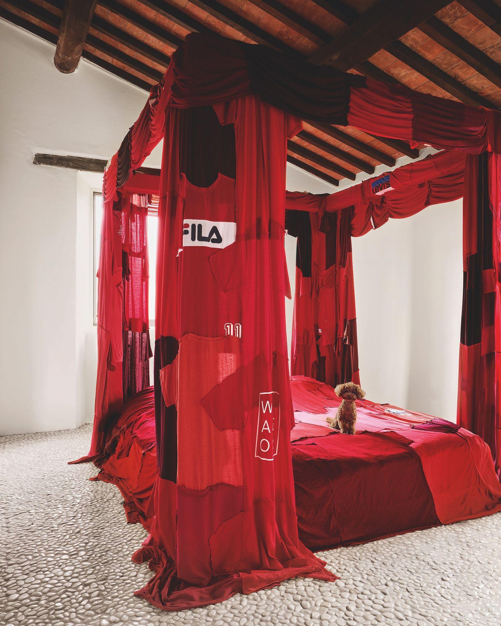 В спальне дизайнер декорировал балдахином над кроватью не привычной тканью, а полотном, сшитым из 120 красных футболок, найденных на блошиных рынках.
