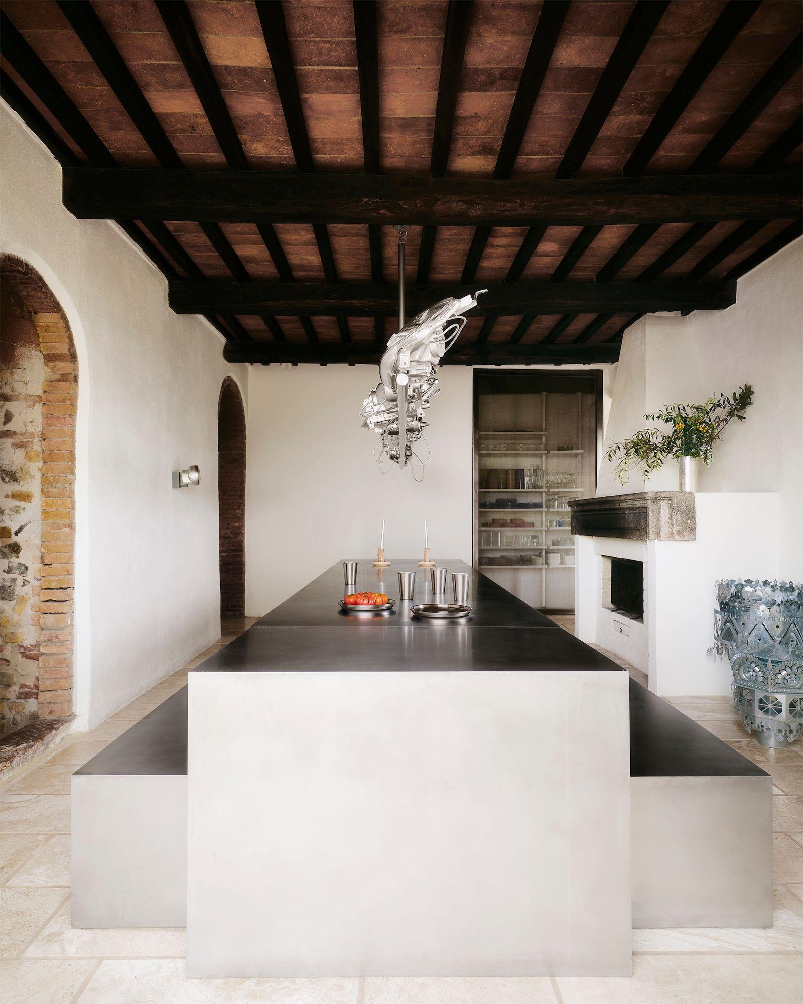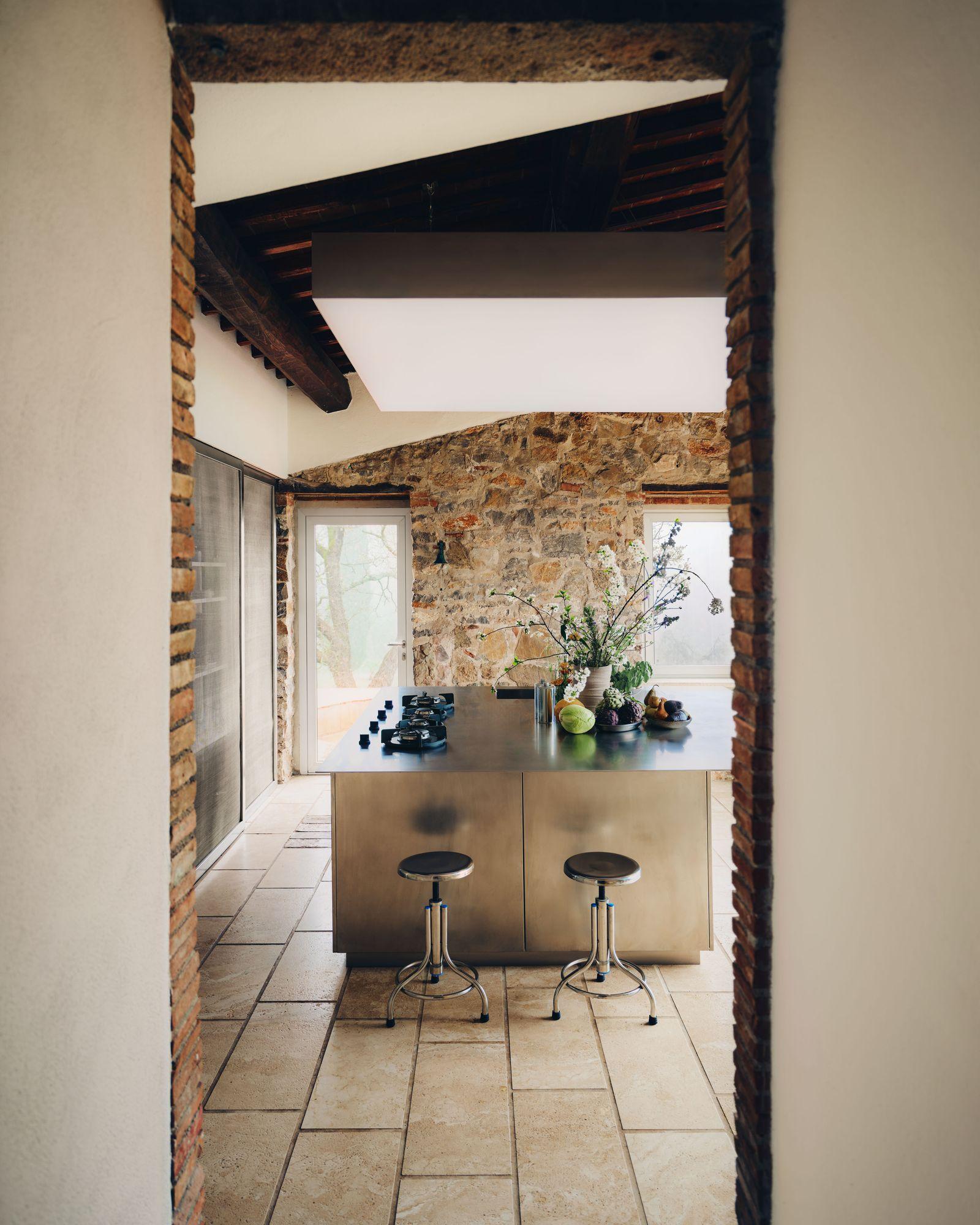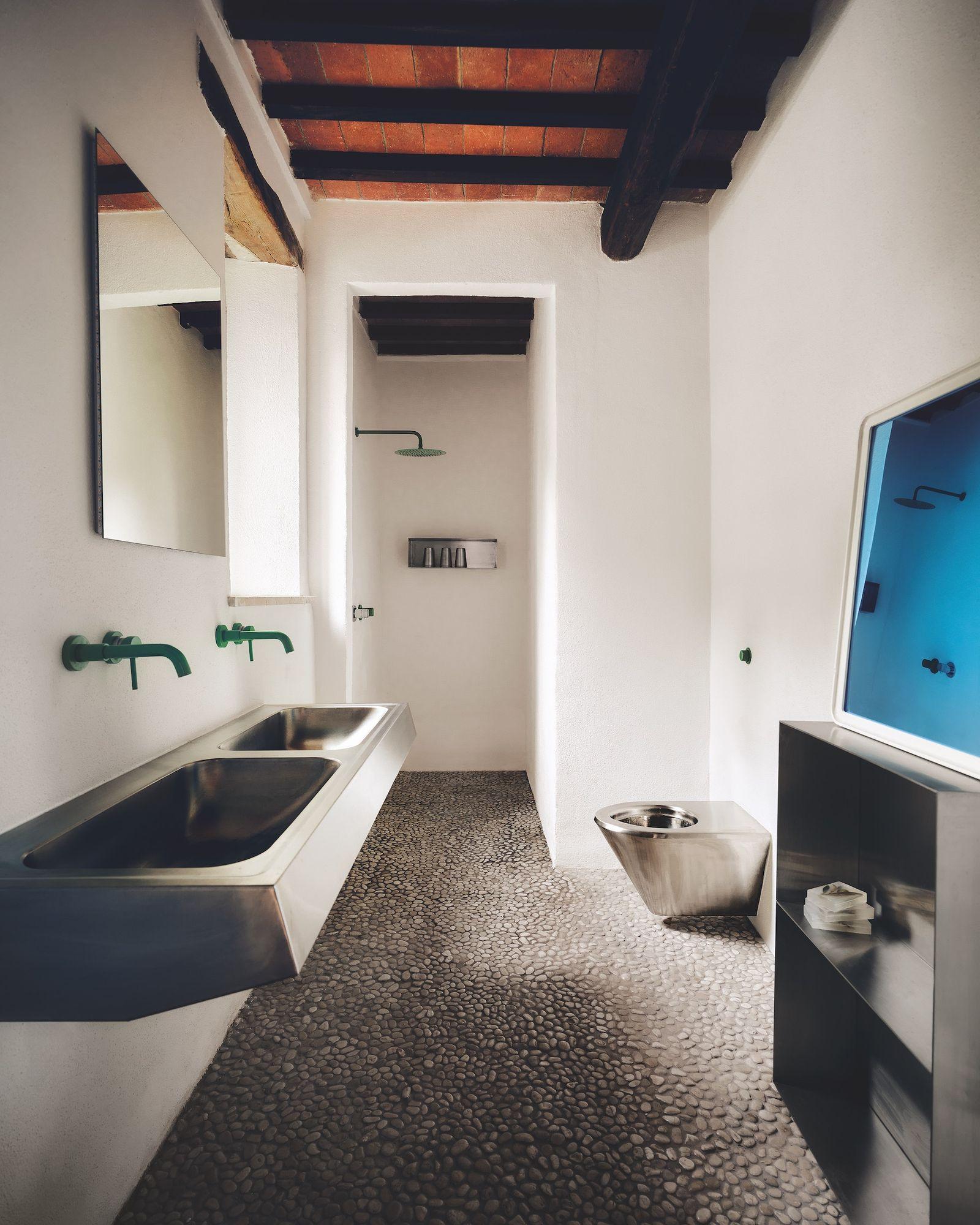 Традиционную для Тосканы палитру дополнили хромированными поверхностями: длинным обеденным столом из нержавеющей стали, металлическими табуретами в кухне и даже санузлом из общественного туалета.