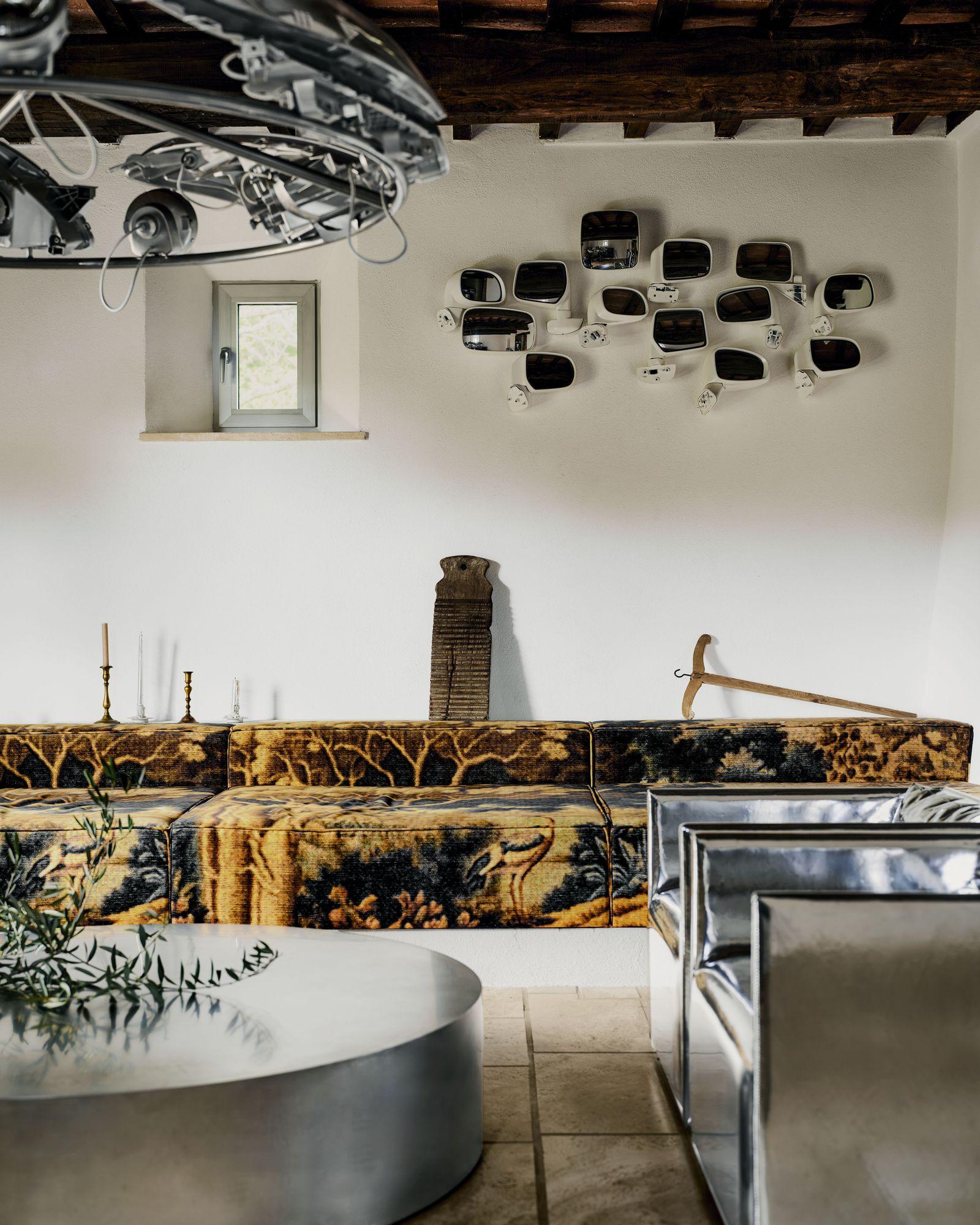 Одна из главных особенностей интерьера — светильники из автомобильных фар в гостиной и композиции из зеркал заднего вида, напоминающие работы французской художницы Лин Вотрен. «Мне нравится брать предметы из несвязанных контекстов и использовать их в декоре», — объясняет Нуриев.