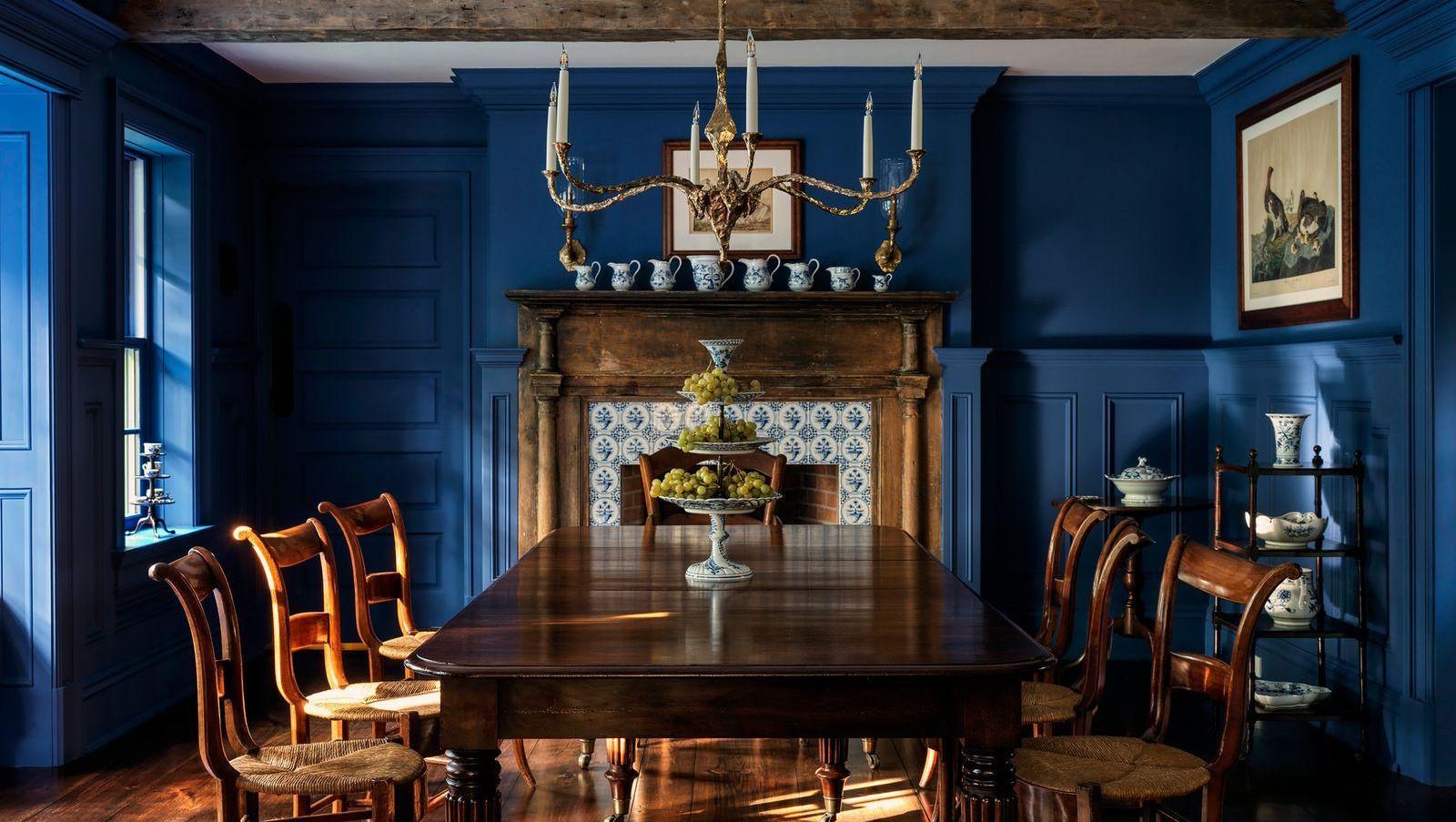 Винтажные стулья из вишни, стол из красного дерева. Стены покрашены в глубокий оттенок синего Dish Blue, Farrow & Ball на стенах. Портал камина выложен расписанной вручную делфтской плиткой. Освещение, Cox London.
