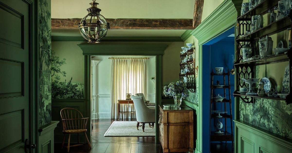 Дизайнер Салли Ригг выбрала оттенок La Pinède, Ressource Paints, который сочетается с обоями Zuber в прихожей. Там тоже стоит антикварная мебель, включая старые виндзорские кресла и часть мейсеннского фарфора. Освещение, Jamb.