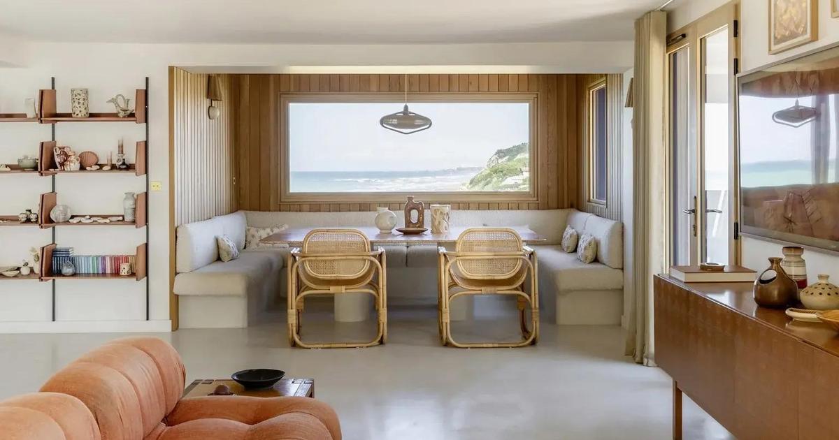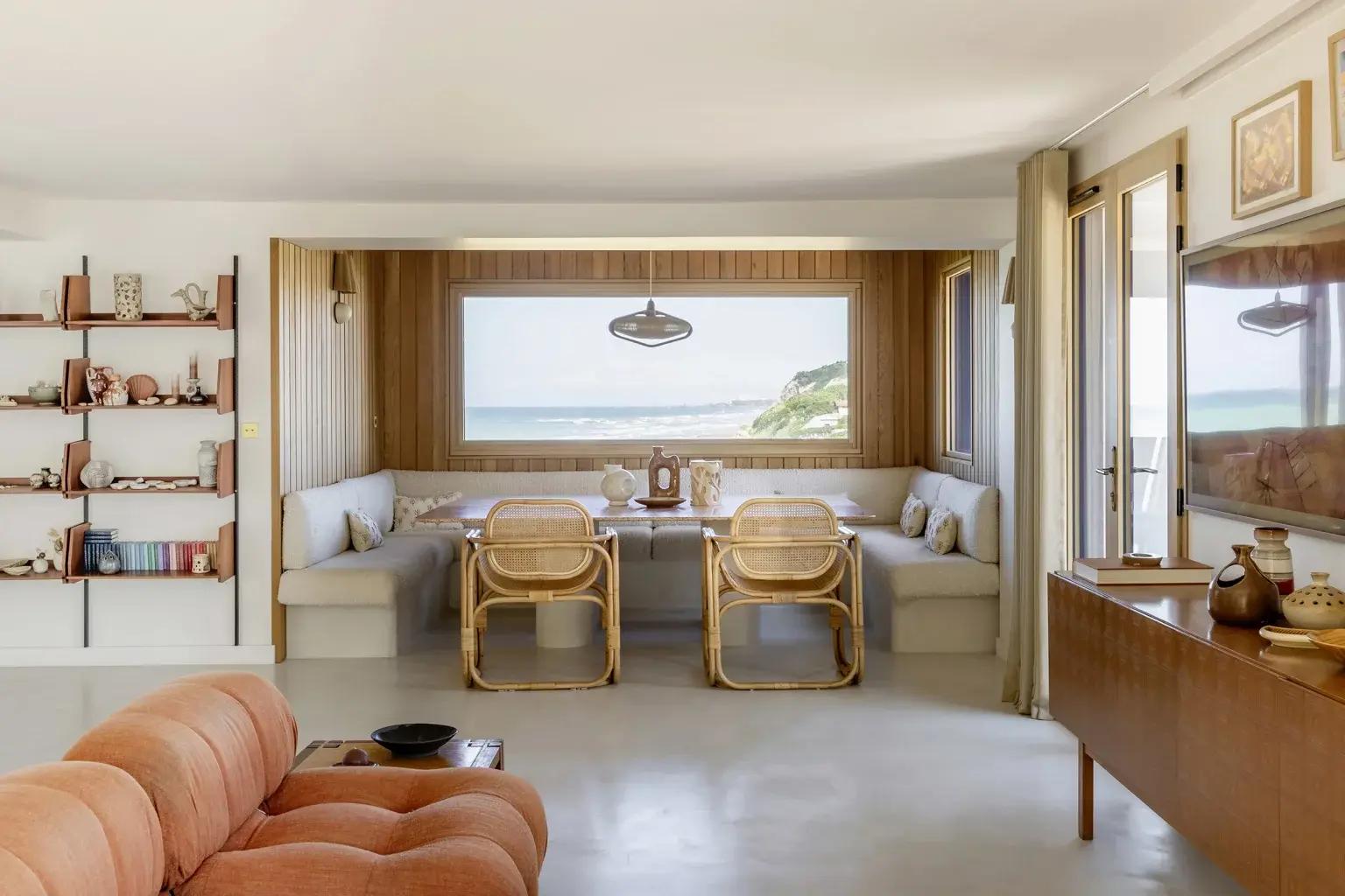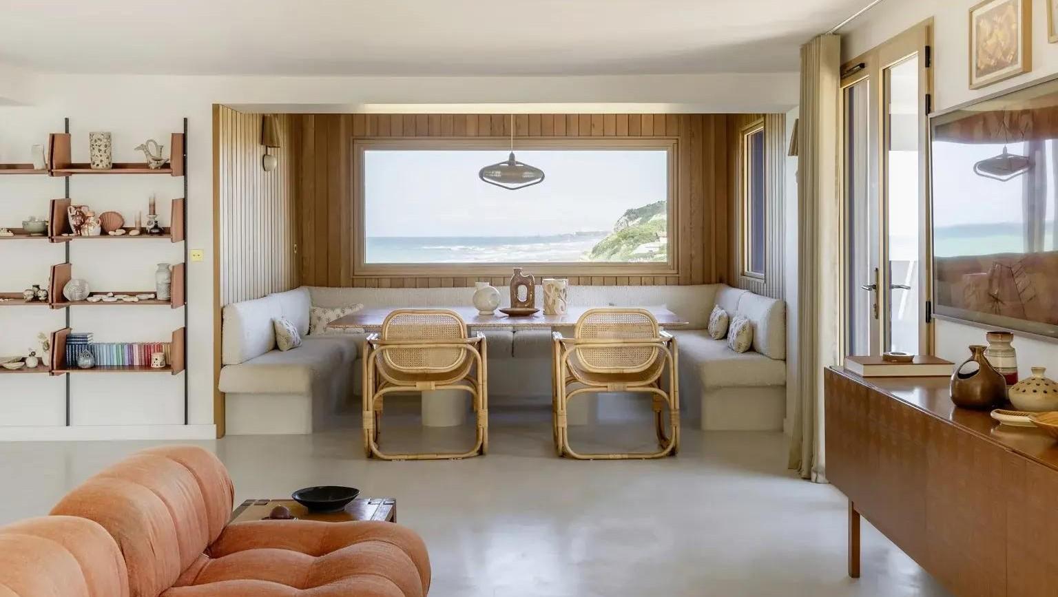 В эркере расположилась столовая с мягкими диванами. Это, пожалуй, самое живописное место в доме: морской пейзаж обрамляют светлые деревянные панели, из-за которых создается ощущение, что это — картина.