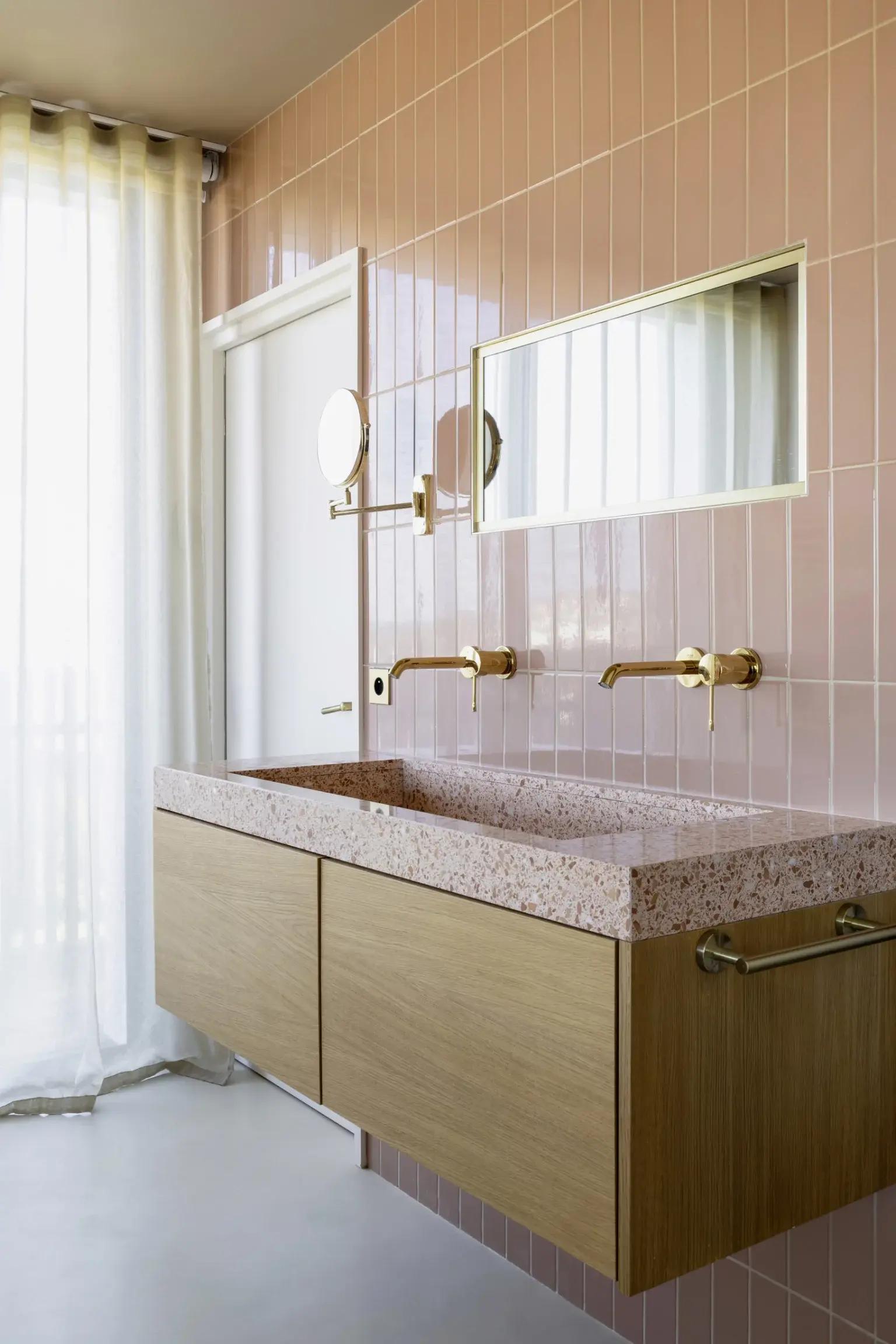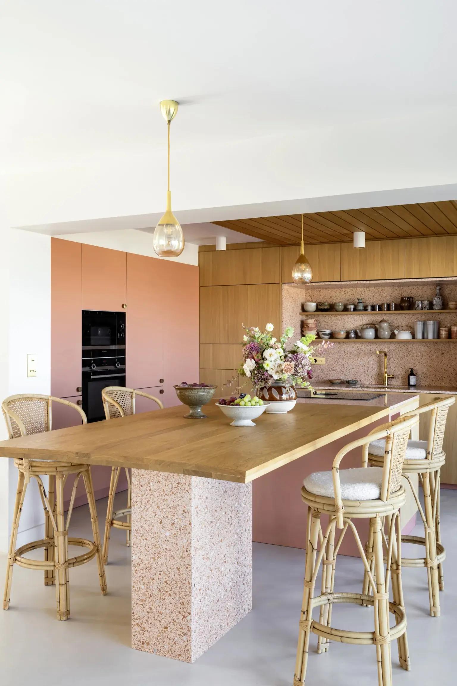 Кухня оформлена нежно-розовым цветом, напоминающим нежный летний закат. Ненавязчивым акцентом здесь выступает мрамор терраццо (такой же, как и в ванной).