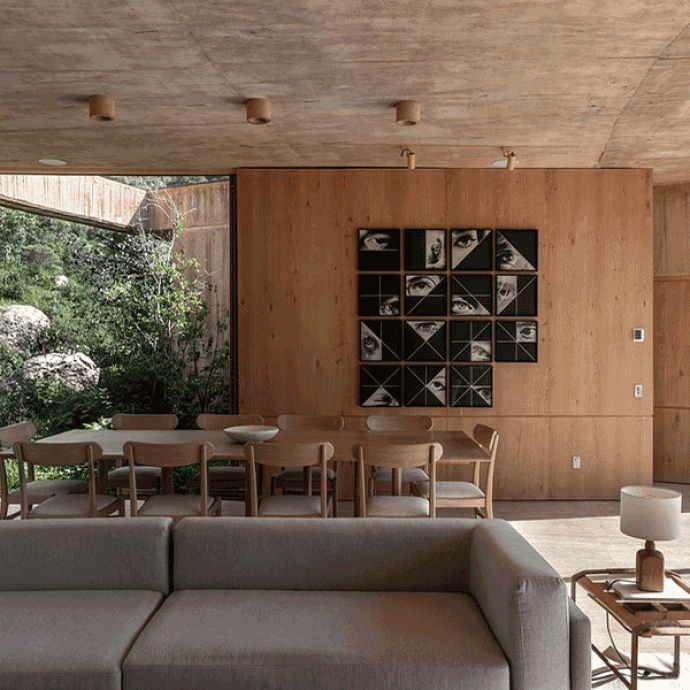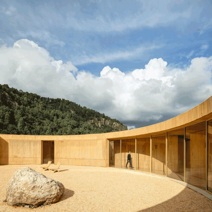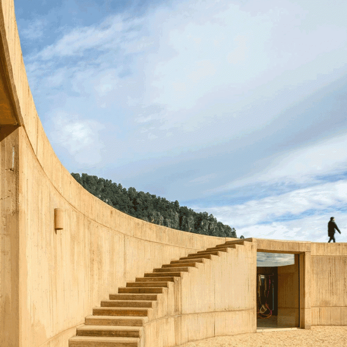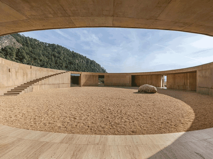Круглая планировка, разработанная на одном уровне и дополненная большой доступной террасой на крыше, противопоставляет прямоугольные помещения — спальни, ванные комнаты, гардеробные и кухню — изогнутым стенам, облегчающим перемещение. Эти стены расширяют пространство, а террасы плавно переходят в внешние фасады, размывая границу между интерьером и ландшафтом.