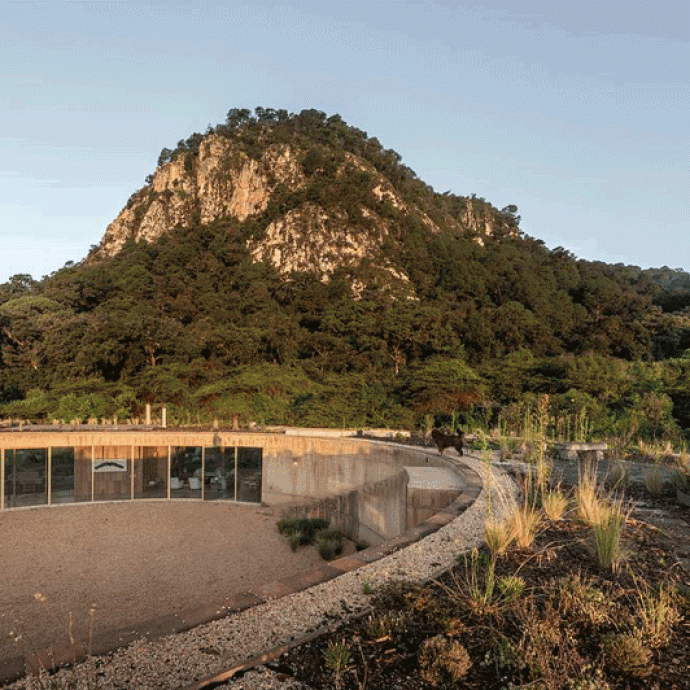 Комплекс состоит из трех отдельных объемов. В круглом главном доме расположены жилые зоны и спальни. Отдельная студия служит гостевой спальней или рабочим местом. Третий прямоугольный объем, организованный вокруг внутреннего дворика, включает в себя дополнительные спальни, кладовые и подсобные помещения.