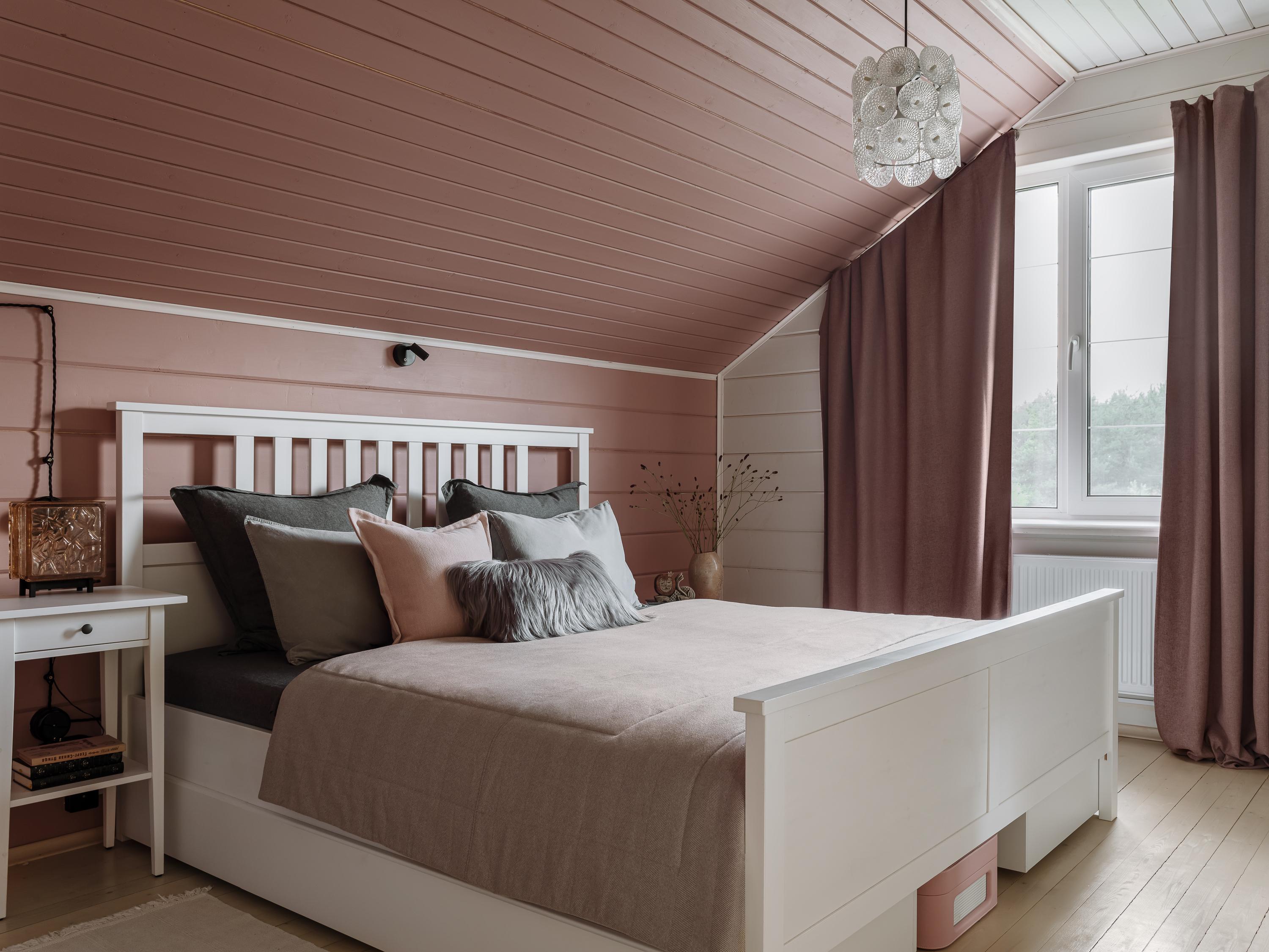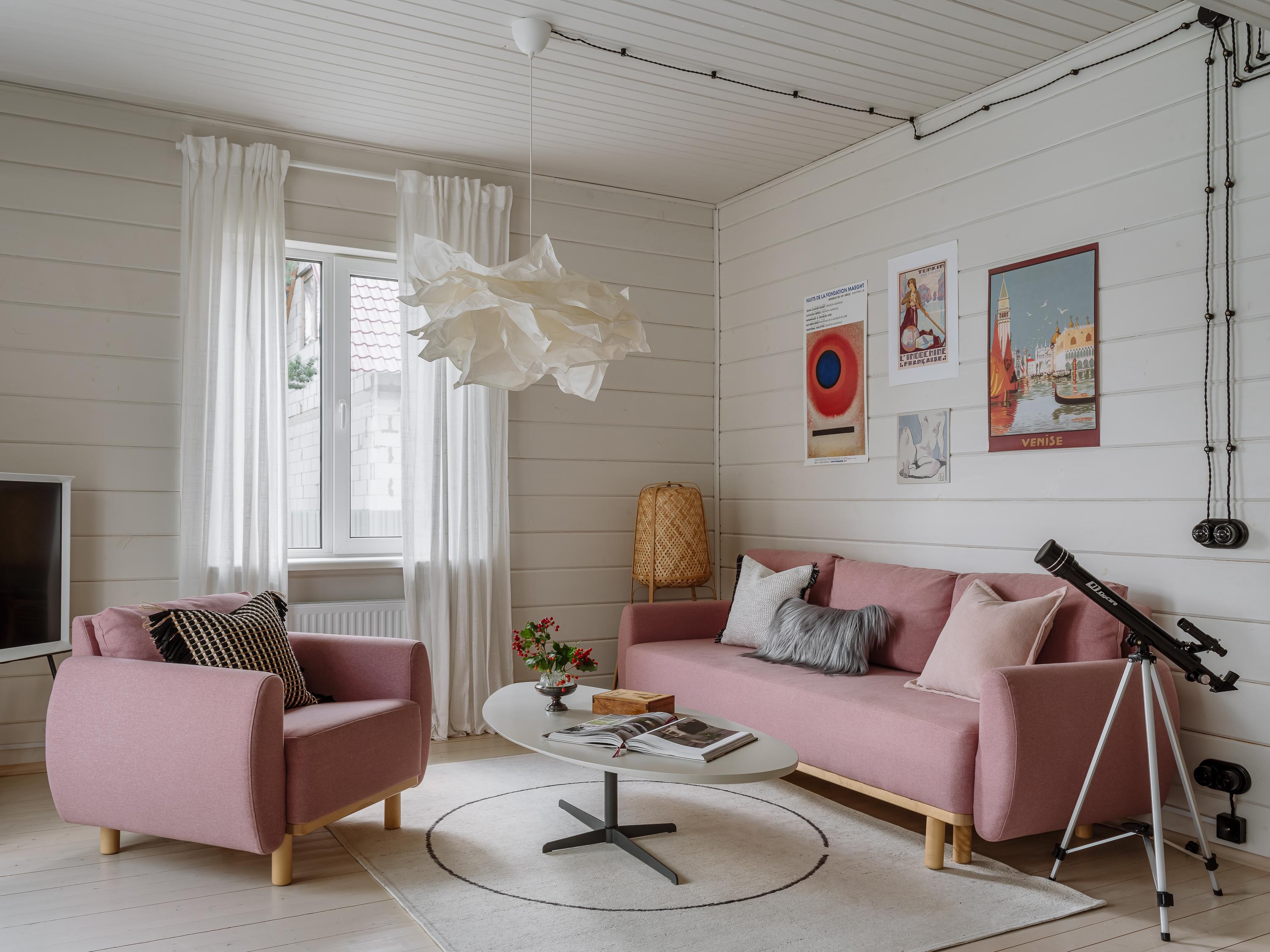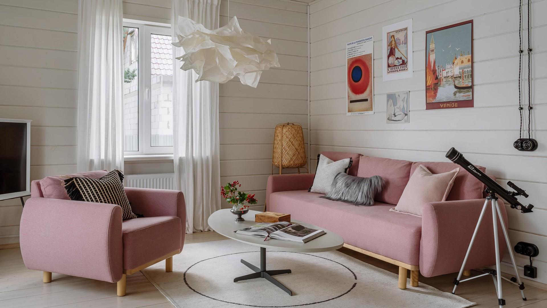 Цветовая гамма: теплые оттенки белого, сливочный и светло-бежевый, которые задают ощущение света и простора. В каждой комнате присутствуют акценты: пудрово-розовые диваны, серо-оливковые стены, винтажное дерево, графитовые и темно-серые шторы — все это придает глубину, но не перегружает.