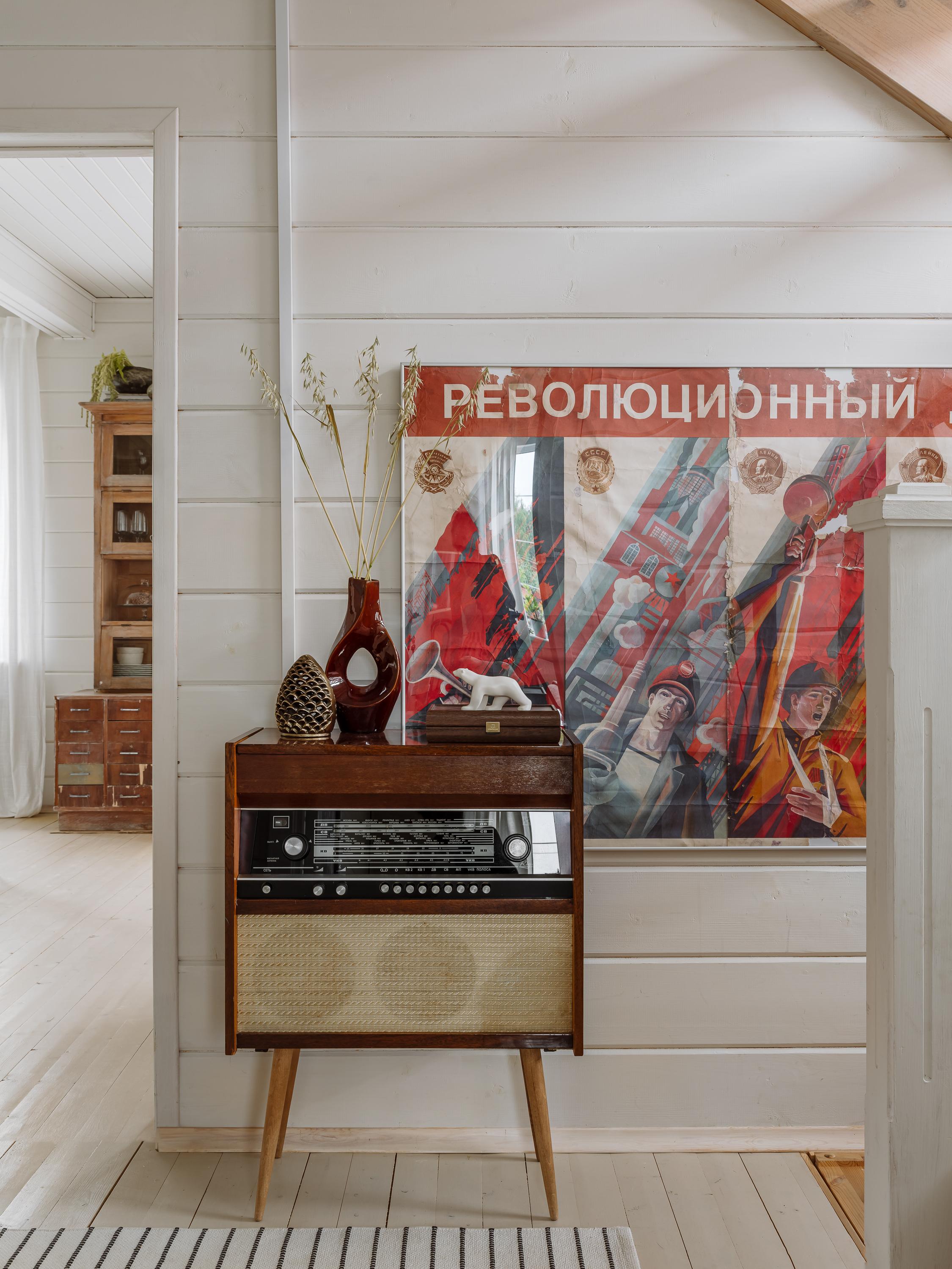 Плакат, Chronosfactor. Радиола Rigonda — отреставрированная и действующая, теперь в ней даже Bluetooth. Ваза — от мамы. Фигурка медведя — сувенир из музея d'Orsay, миниатюра скульптуры «Белый медведь» скульптора Франсуа Помпона