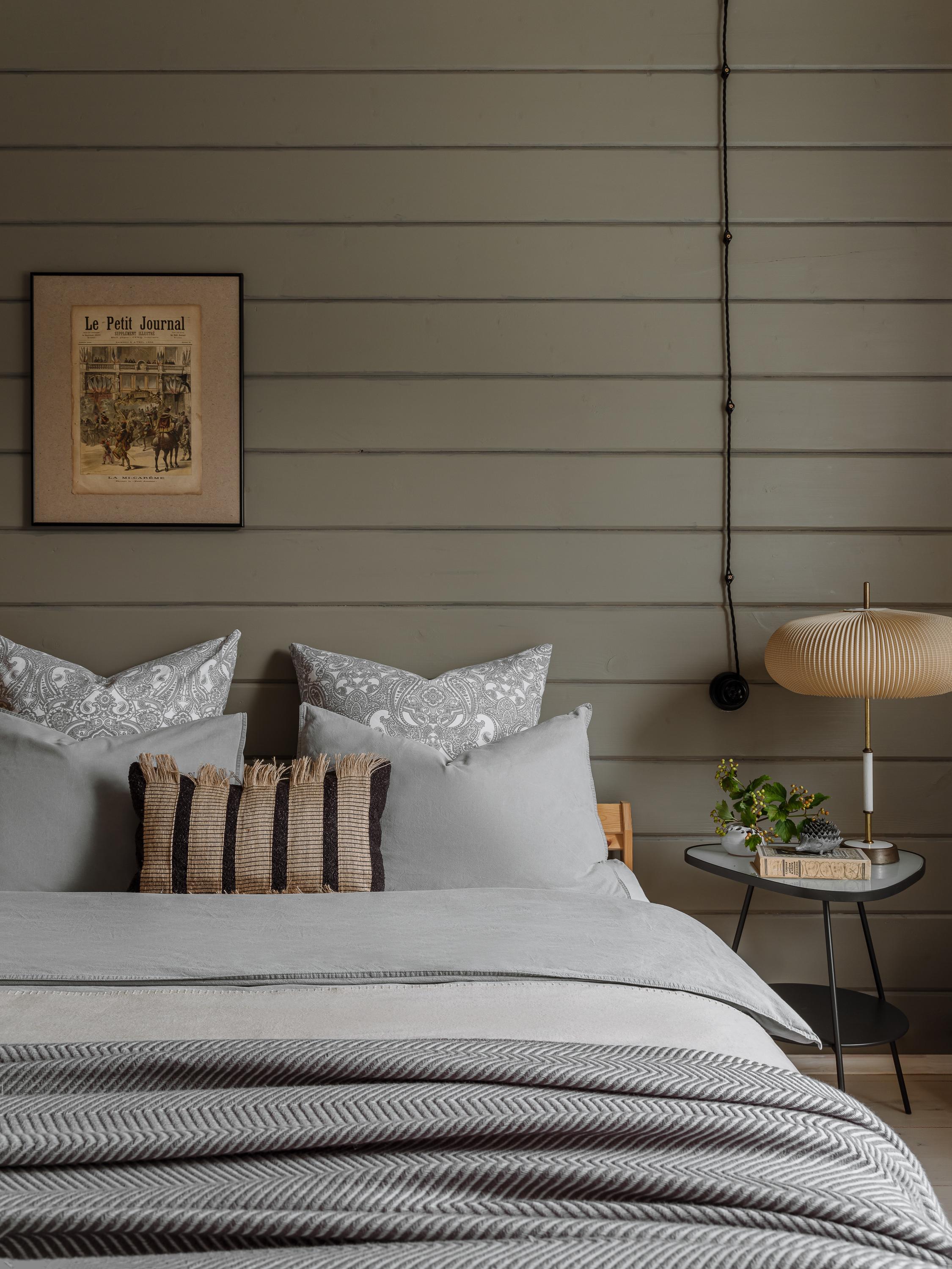 Спальня родителей. На стене вырезки из Le Petit Journal (привезены из Бангкока). Подушки и плед — Alberta Décor. Светильник спасен с дачи родительских друзей, которую продавали