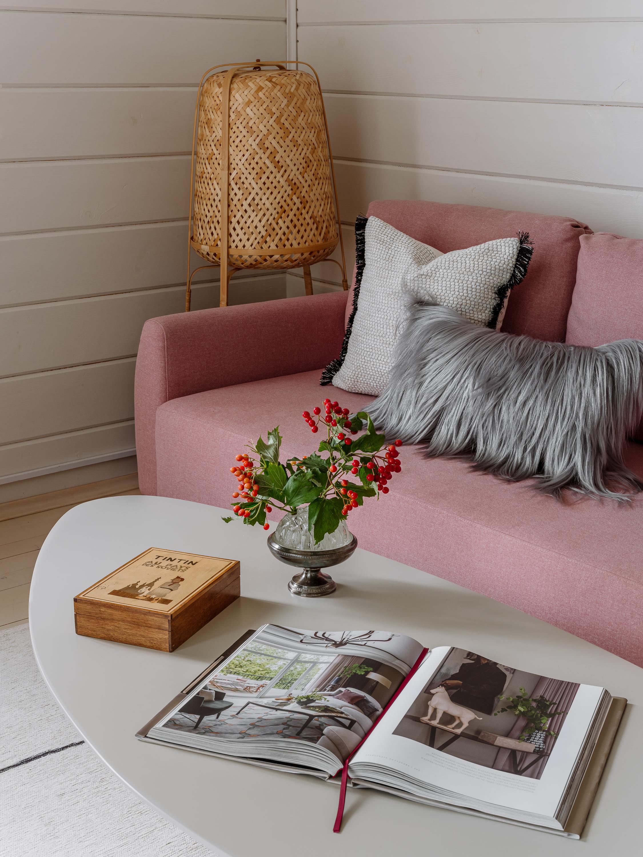 На журнальном столике ваза с дырочками под каждый цветок букета, купленная на блошином рынке в Париже. На диване сидит любимица семьи — корги Арлетт