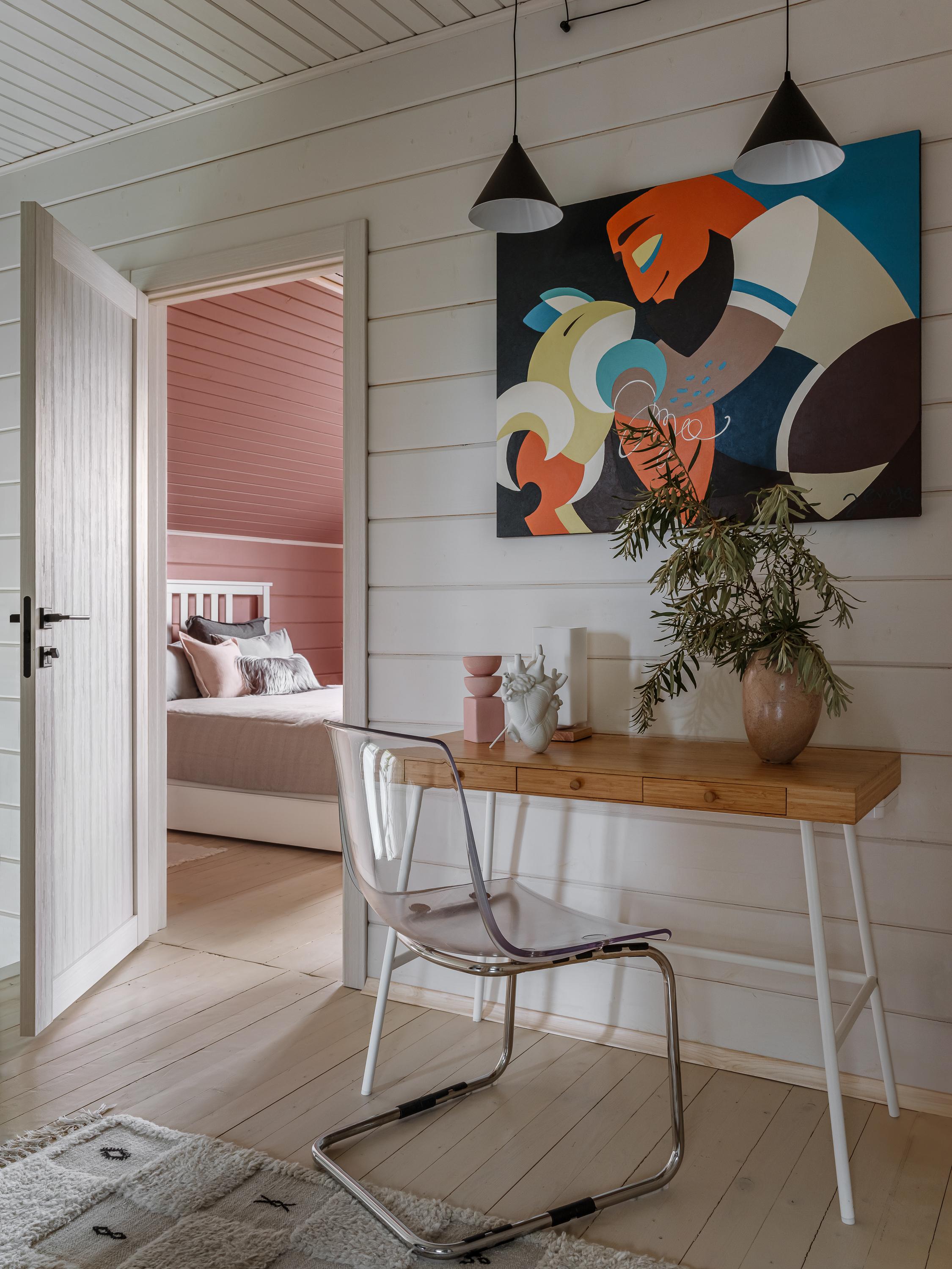 Стол и стул, ИКЕА. Картина — Jenya Jary (Женя Жарый). Ваза, Seletti. Подсвечник, H&M Home