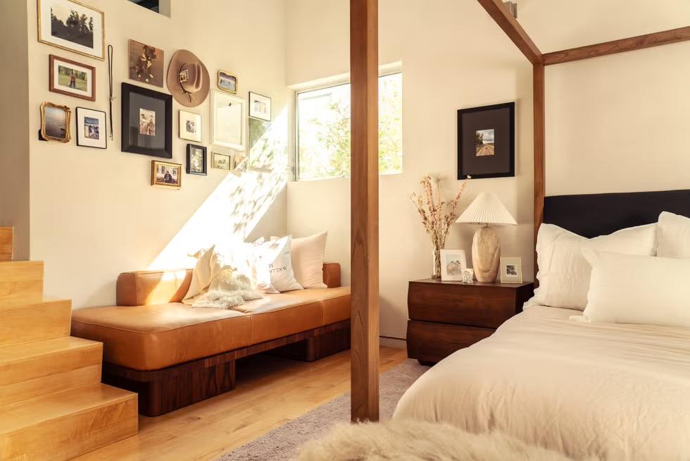 В спальне можно заметить много фотографий и памятных вещей, компактно размещенных на стене. В солнечный день на них красиво падает свет из окна. А под ними — кожаная кушетка, стилизованная под 1970-е, один из любимейших предметов интерьера Молли. «Это один из тех предметов мебели, которые одинаково хорошо смотрятся как в спальне, так и в кабинете. Цвет воловьей кожи придает комнате уют, и мне нравится, что с возрастом она становится только лучше».