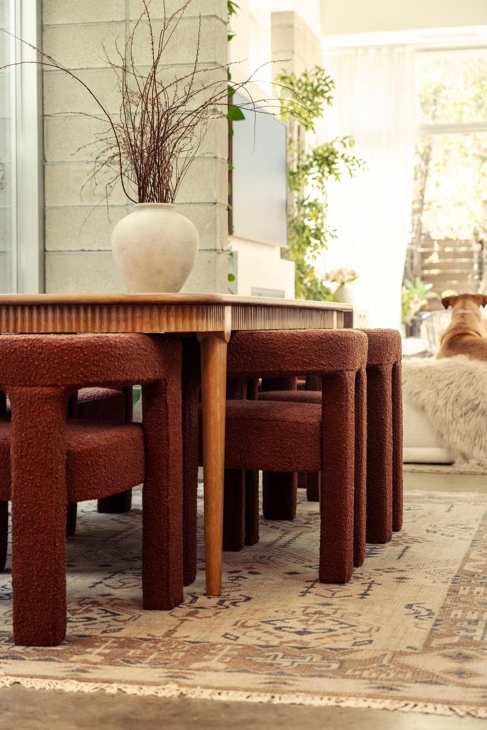 «Я много экспериментировала с текстурой. Я считаю, что, как и в случае с модой, именно мелкие детали делают интерьер особенным и интересным», — говорит Диксон. Самый контрастный пример сочетания текстур — рифленые края деревянного обеденного стола и терракотовые стулья с обивкой букле.